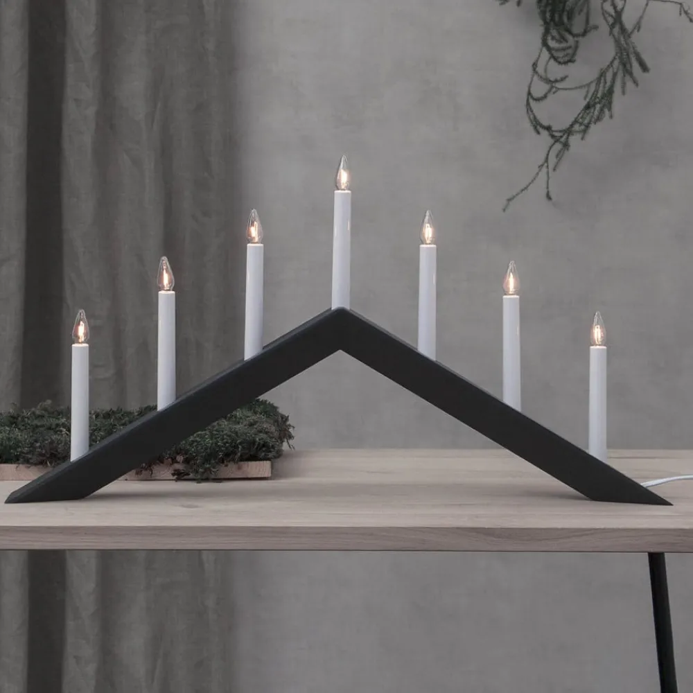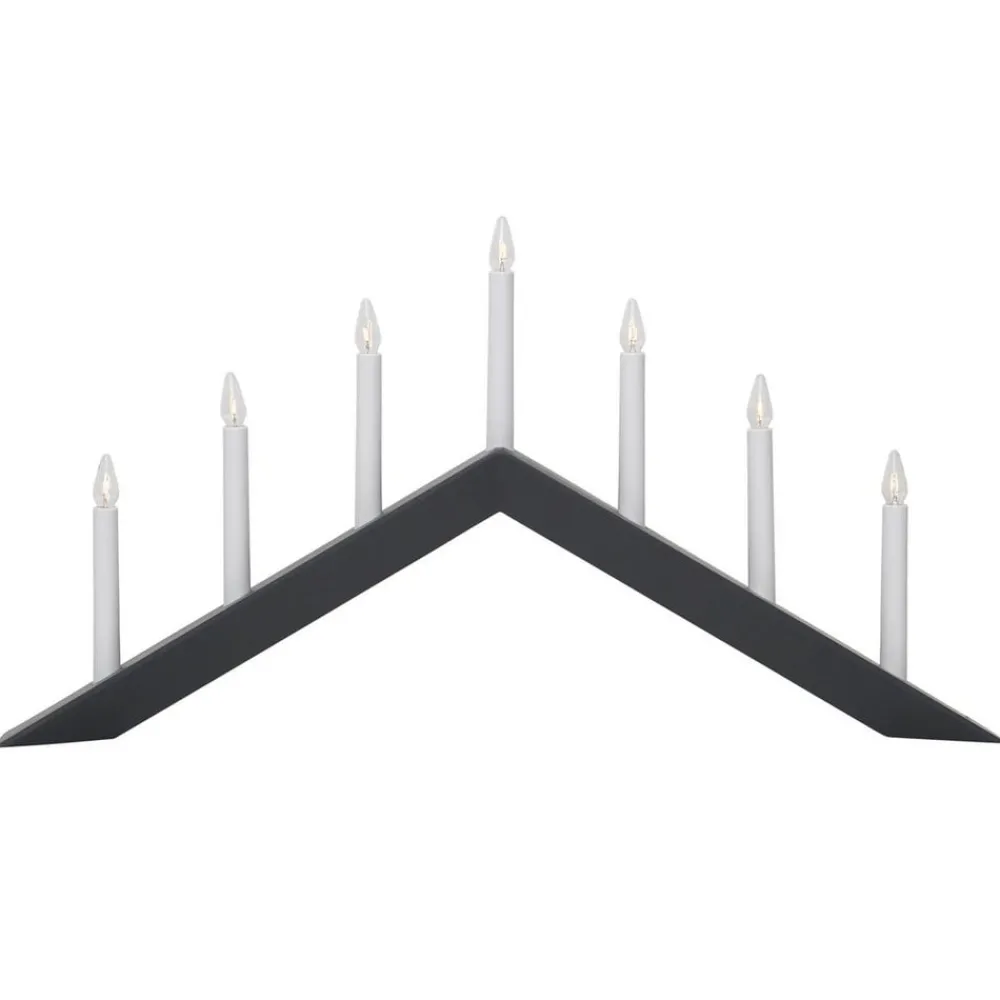 Trendy Arrow vinduslysekrone – flatt vinklet Denne lysekronen har en sterk tilstedeværelse takket være sitt puristiske helhetsinntrykk og er ideell til juledekorasjoner i mange forskjellige boligstiler. Enten det er snakk om en moderne eller naturinspirert boligstil, gir vinduskronen med syv flammer en dekorativ aksent i alle kombinasjoner og skaper samtidig en koselig atmosfære med sitt myke lys. Inkluderer bryter på ledningen. Pærer (inkludert erstatningspærer) inkludert – designet av Charlotte Falck