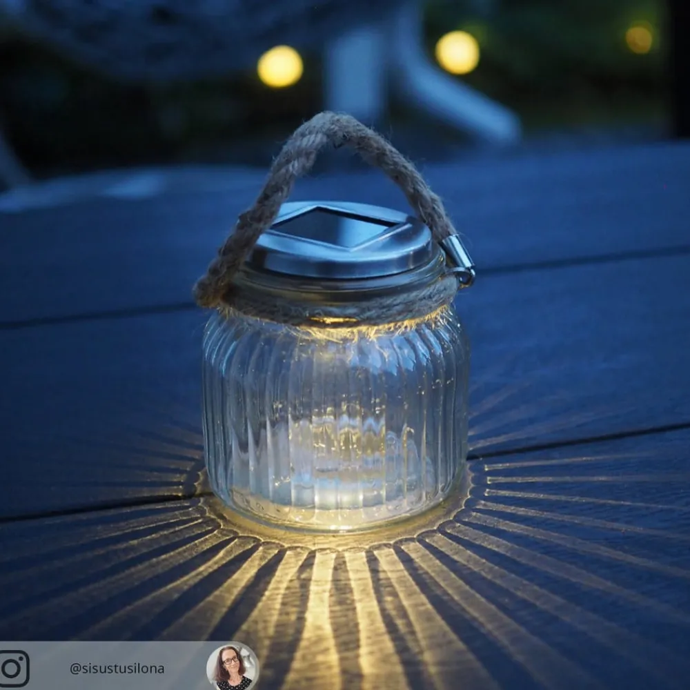 Allsidig solcelle bordlampe Jar i glass med sissalhank og stemningsfullt lys