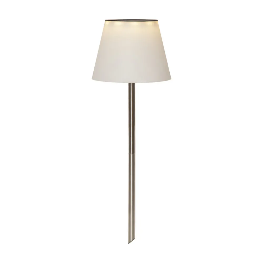 Solcelledrevet Solini LED-lampe med jordspyd og hvit lampeskjerm Solini LED-gulvlampe ser ut som en bord- eller gulvlampe med en konisk lampeskjerm av hvit plast. Lampen har også en sølvfarget ramme i rustfritt stål som kan monteres i tre ulike lengder før bruk. Takket være solcellepanelet og det oppladbare batteriet trenger Solini ingen strømtilkobling. Den kan slås på automatisk takket være en skumringssensor.