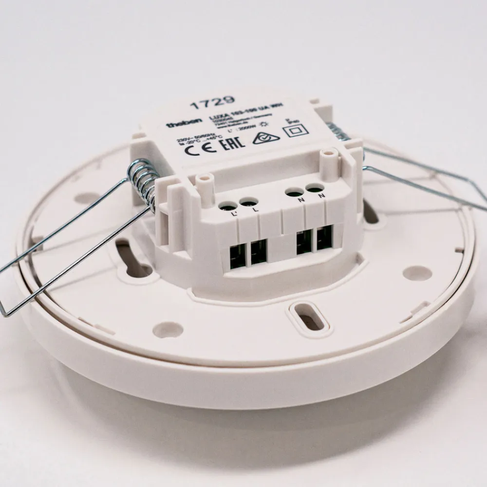 Denne bevegelsessensor kan bygges inn i taket – også under gips – og overtar den automatiske lysstyringen avhengig av tilstedeværelse og lysstyrke. registreringsvinkel er 360°. Dekkklemmer leveres for å begrense deteksjonsområdet. Følsomheten til sensoren kan også begrenses etter behov. Den ideelle monteringshøyden er 2,5 til 3 meter. Takket være fabrikkinnstillingen kan Luxa 103-100 settes i drift umiddelbart.