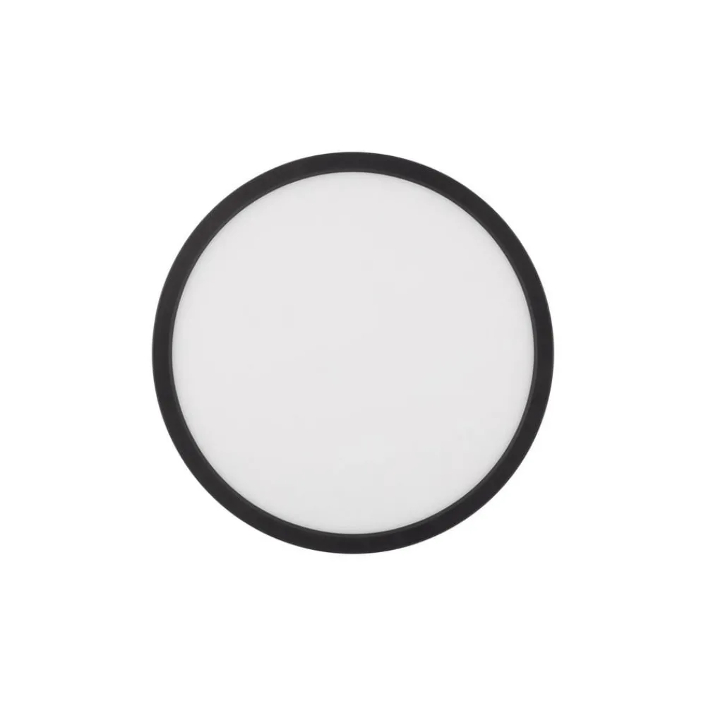 Rundt Aqua LED-panel til baderommet, med svart ramme Aqua LED-taklampen er utformet som et flatt utenpåliggende panel i rund form. Diffusoren er laget av satinert plast som gir et bredt lysbilde, og er omgitt av en svart metallramme. Takket være kapslingsgrad IP54 kan Aqua uten problemer brukes på baderom og vaskerom – Fargetemperaturen på lyset kan stilles inn før idriftsettelse (3 000 K / 4 000 K / 6 500 K) – Dimbar: bare trykk på veggbryteren i rask rekkefølge