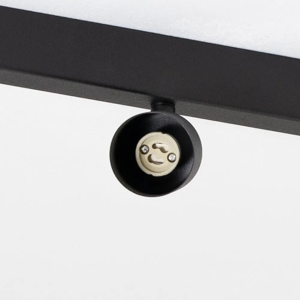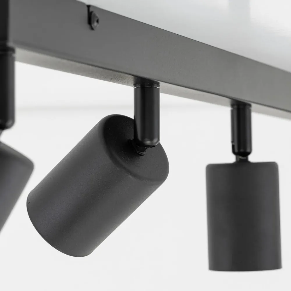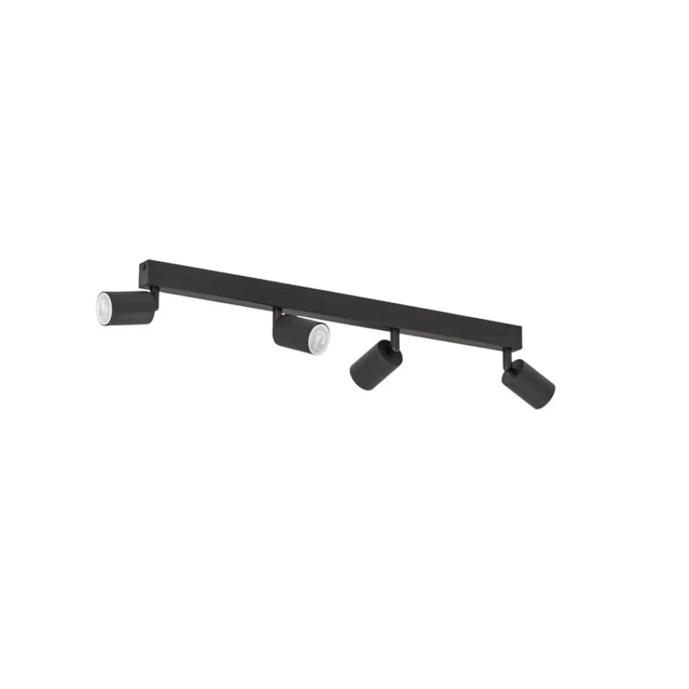 GU10-downlight Top i stål med svart finish består av en lang baldakin og fire sylindriske spotterhoder plassert på rad. Spotterhodene er justerbare, slik at lyset kan rettes mot ønsket område.
