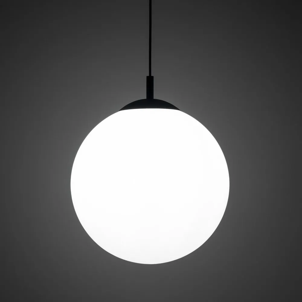 Esme glasspendel med opal sfærisk skjerm Esme-pendelen er tiltalende med sin sfæriske skjerm i opalt glass som sprer lyset fra lyskilden homogent. Feste, kabel og baldakin er utført i svart.