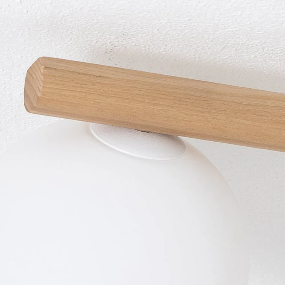 Estera taklampe med trebjelke og tre kuleformede skjermer i opalt glass Med sine tre kuleformede skjermer i opalt glass, som hver har en fatning med G9-sokkel, gir Estera taklampe behagelig belysning på alle sider. Lampen har også en bjelke i lyst tre og en baldakin i hvit metall.