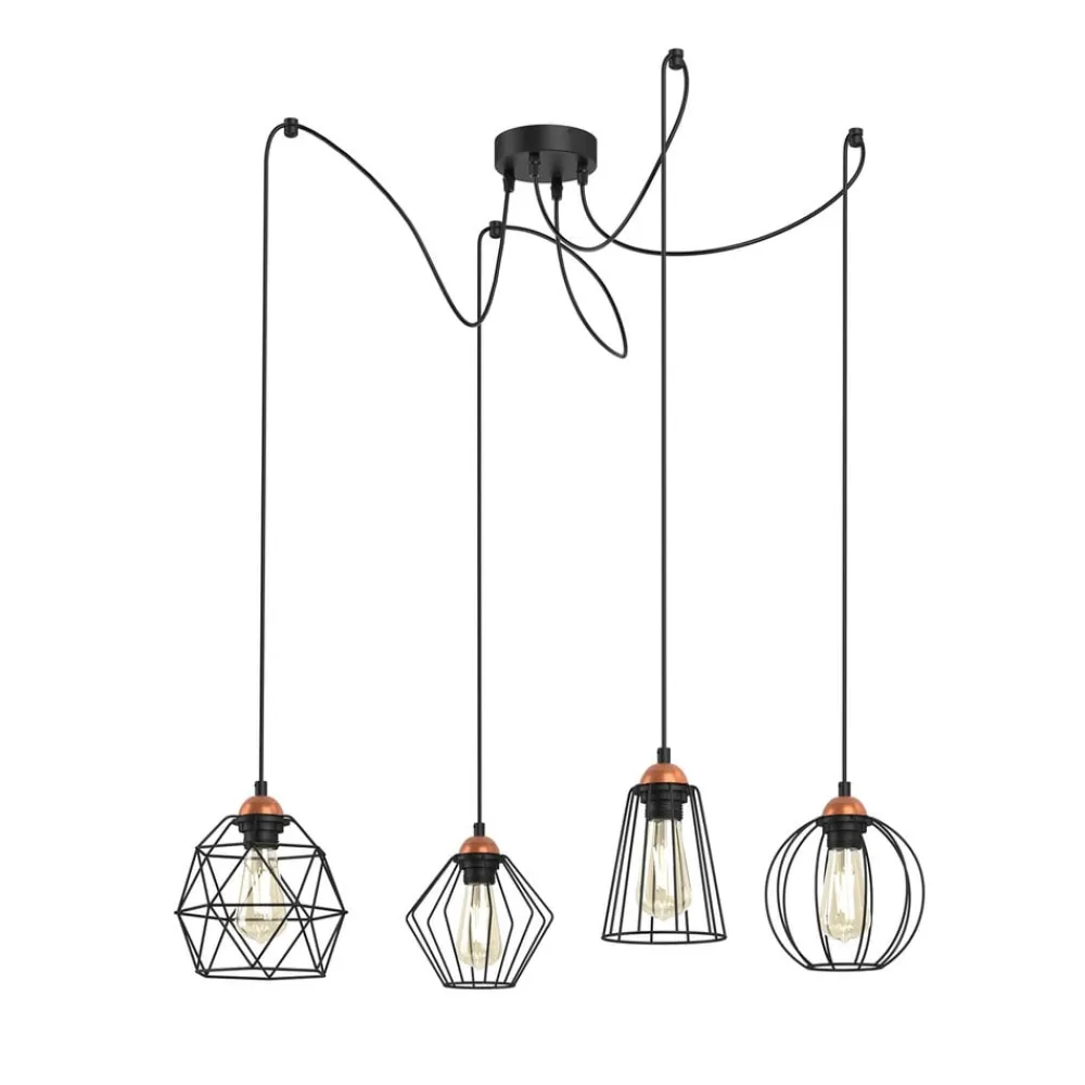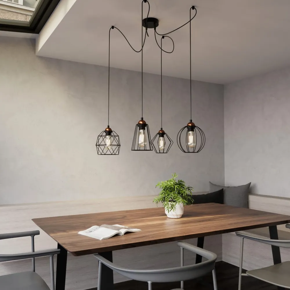 Hengelampen Galaxy med fire burskjermer kombinerer moderne design med funksjonell fleksibilitet. Denne lampen er laget av høykvalitets metall og plast og passer perfekt inn i moderne oppholdsrom som stuer, kjøkken eller spisestuer. Den desentraliserte opphenget gjør det mulig å skreddersy lampen, slik at den gir hvert rom et personlig preg.
