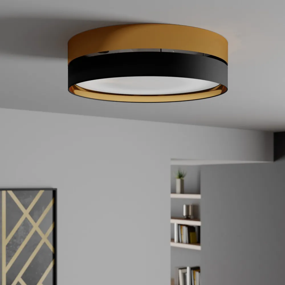Taklampen Hilton kombinerer moderne design med høykvalitetsmaterialer som tekstil og metall. Kombinasjonen av svart og gullfinish gir ethvert rom et luksuriøst preg. Denne lampen er ideell for stuer, ganger, soverom og spisestuer, og passer perfekt inn i ulike interiørstiler.