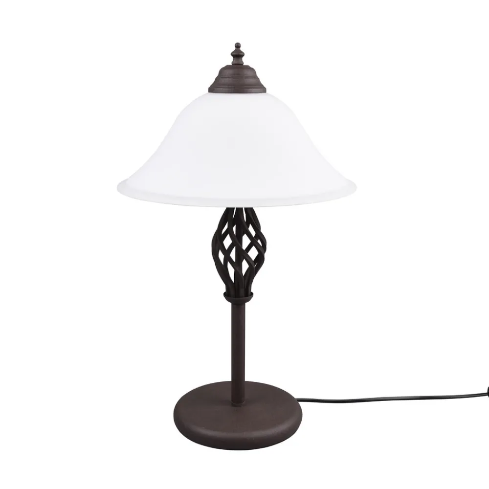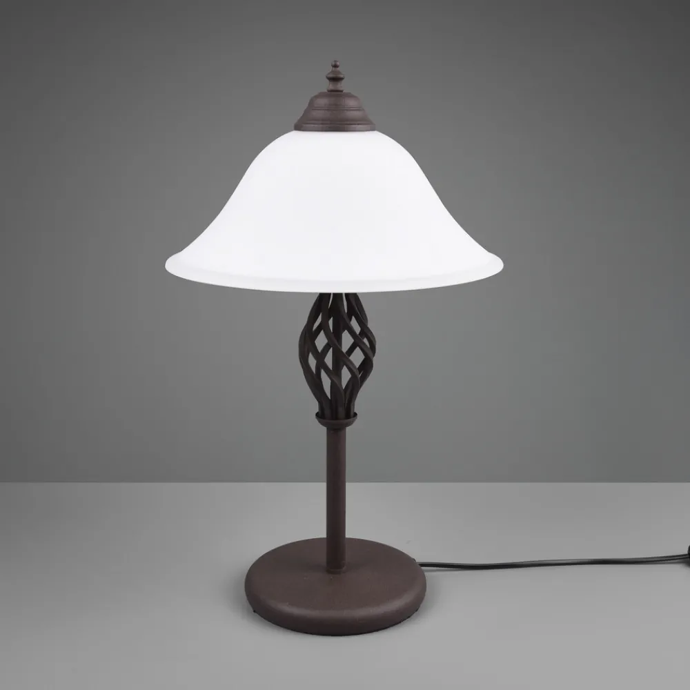 Rustica bordlampe er laget av rustfarget metall og en hvit glassskjerm som gir plass til to E14 lamper. Lampen egner seg som et dekorativt blikkfang i stua, men kan for eksempel også brukes som lyskilde på kontoret eller som leselampe på soverommet. På grunn av sin spesielle design, passer bordlampe fantastisk inn i antikke, rustikke eller landlige stuer. Lampen betjenes via den integrerte ledningsbryteren.