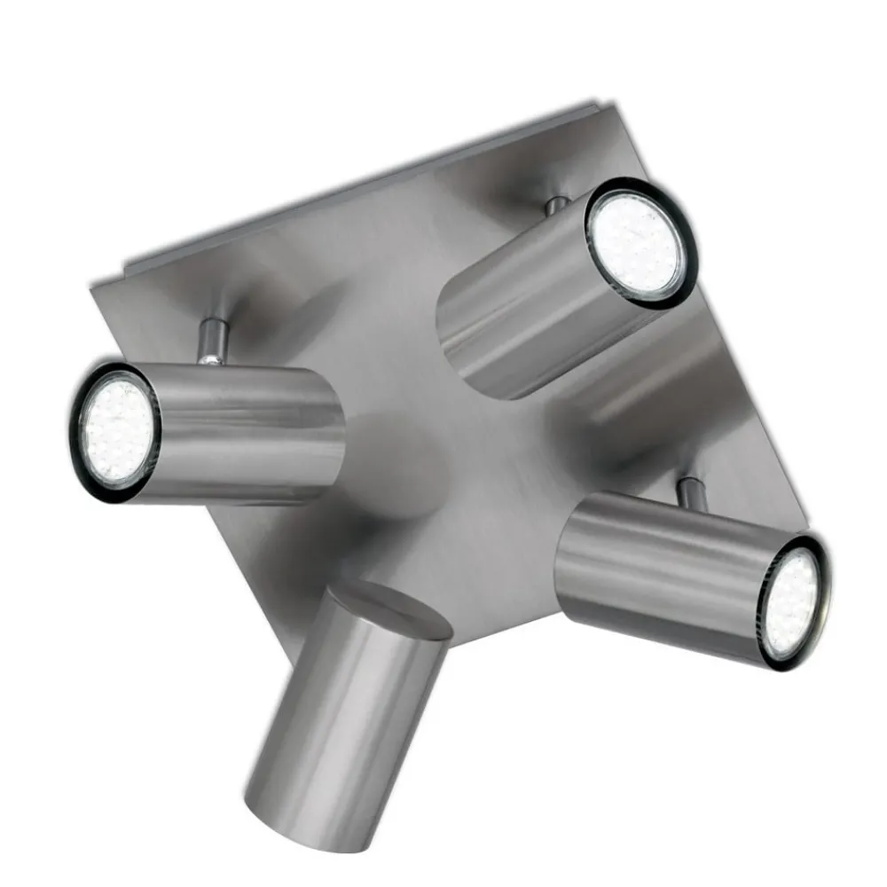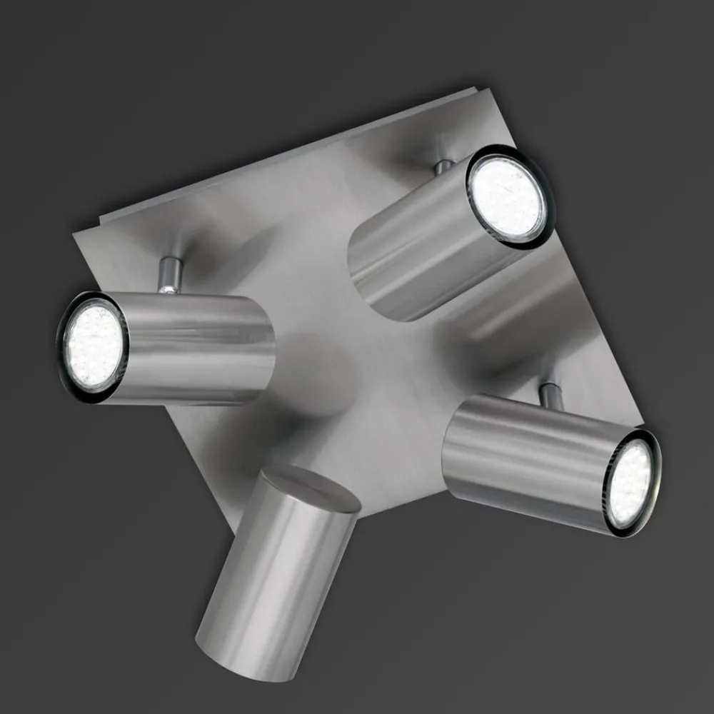 Egner seg til aller rom og er svært praktisk: Den matt-nikkelfargede taklampen har en kvadratisk grunnform med fire halogenspotter. Spotten kan dreies i forskjellige retninger, slik at lyset kan rettes ut etter ønske. Takspotten krever liten plass og egner seg derfor også godt til små rom.