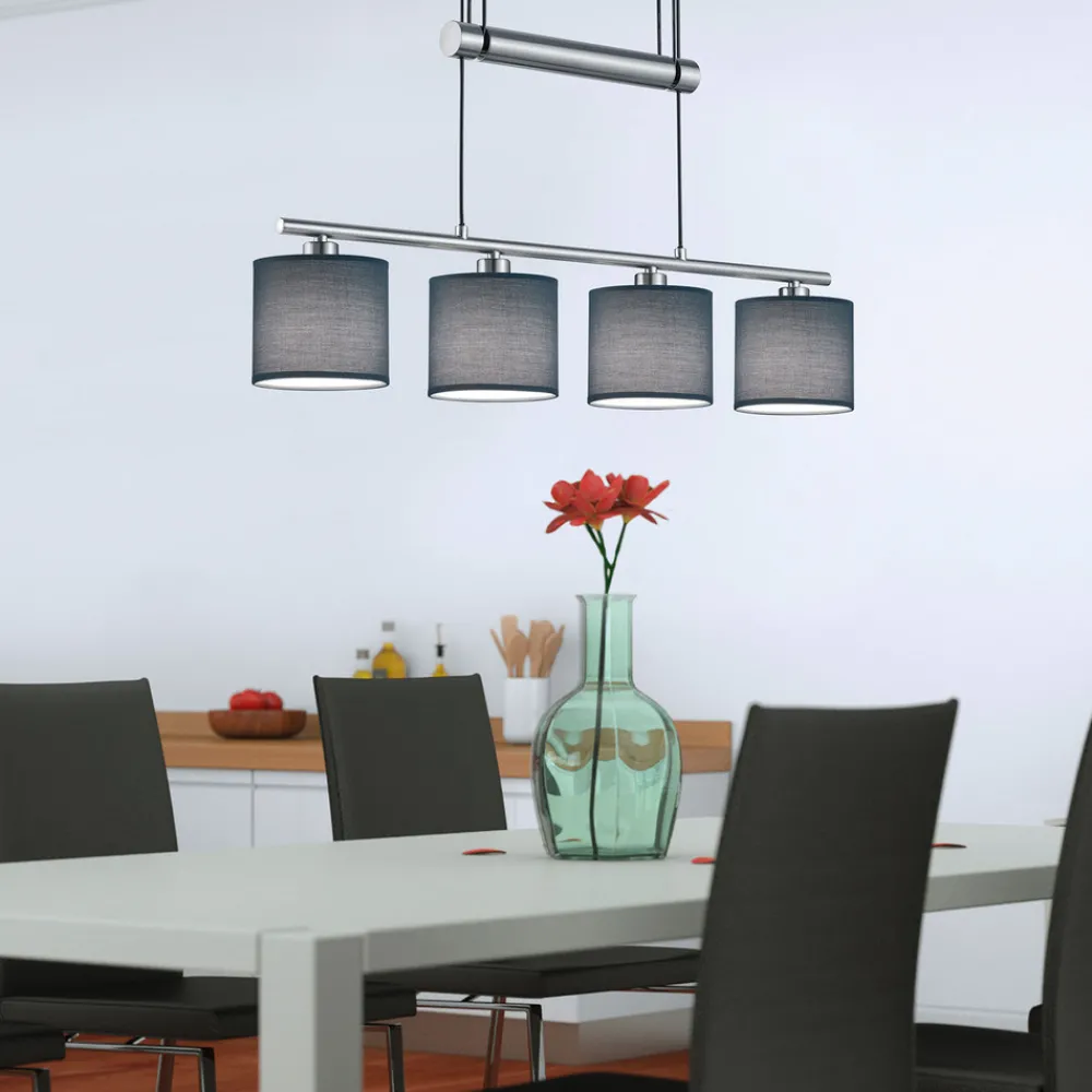 Garda 4 lyskilder pendellampe – høydejusterbar opp til 150 cm Garda 4 lyskilder pendellampe er ideell som bordbelysning i en moderne spisestue eller stue: Fire grå stoffskjermer er spredt over en lengde på 77 cm, og gir direkte nedadrettet lys for en homogen lysfordeling. Lyset trenger også forsiktig gjennom stoffet hele veien rundt, noe som skaper en veldig koselig atmosfære. Høyden på Garda hengelampe kan justeres til ønsket høyde mellom 90 cm og 150 cm ved hjelp av et håndtak.