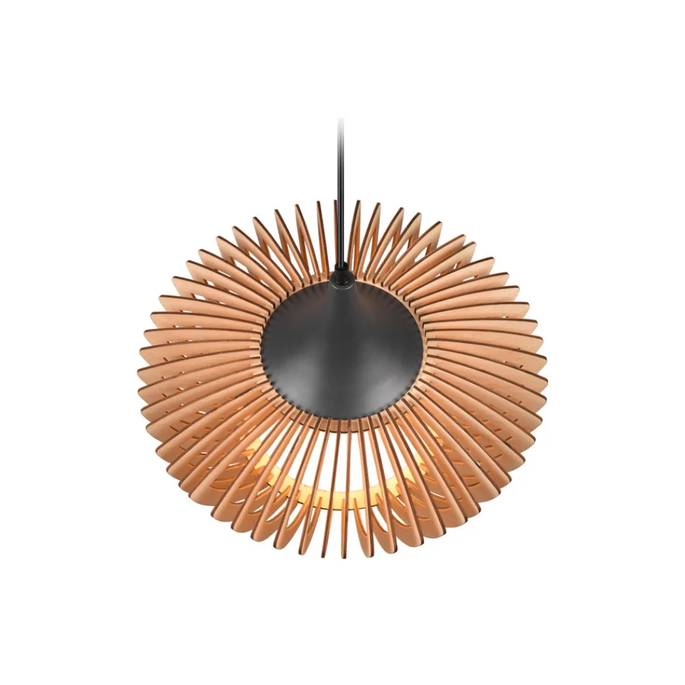 Sjarmerende Colino pendellampe med treskjermDenne pendellampen har en grasiøst buet treskjerm som er satt sammen av en rekke trelameller. Lyset fra den innsatte lampen avgir til alle sider og gir stue og spisestue en koselig grunn- eller områdebelysning.