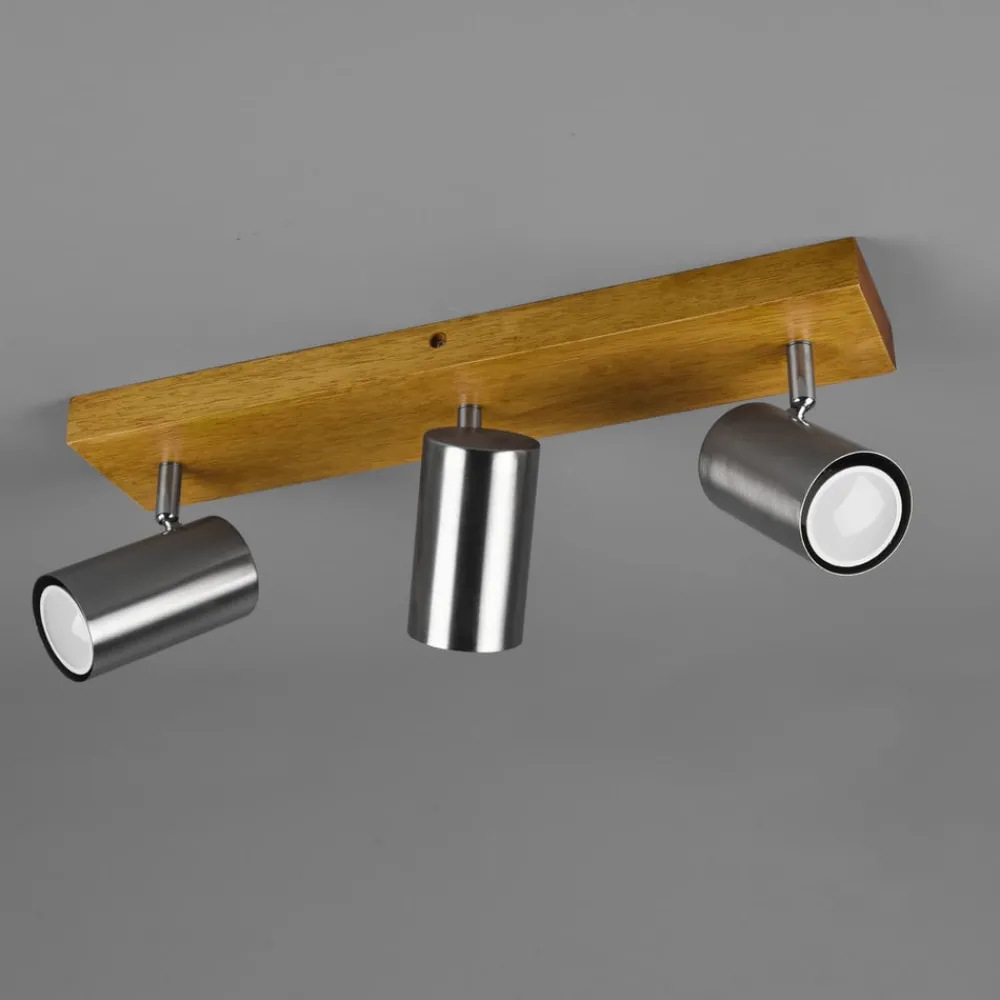 Marley takspotlight med tre fleksible lampehoder Marley downlight ser elegant og moderne ut takket være lampehodene i matt nikkel, og gir også et naturlig preg til ethvert oppholdsrom takket være baldakinen i tre. Lampen kan brukes på en rekke forskjellige måter. Den kan for eksempel brukes som lyskilde i gangen, spisestuen eller stuen, men egner seg også godt til bruk på soverommet. Lyset sendes ut på en fokusert måte og fremhever bestemte områder eller gjenstander. De tre lampehodene kan justeres etter personlige behov og stedets forhold, og de kan roteres og vippes for å sikre ideelle lysforhold til enhver tid.