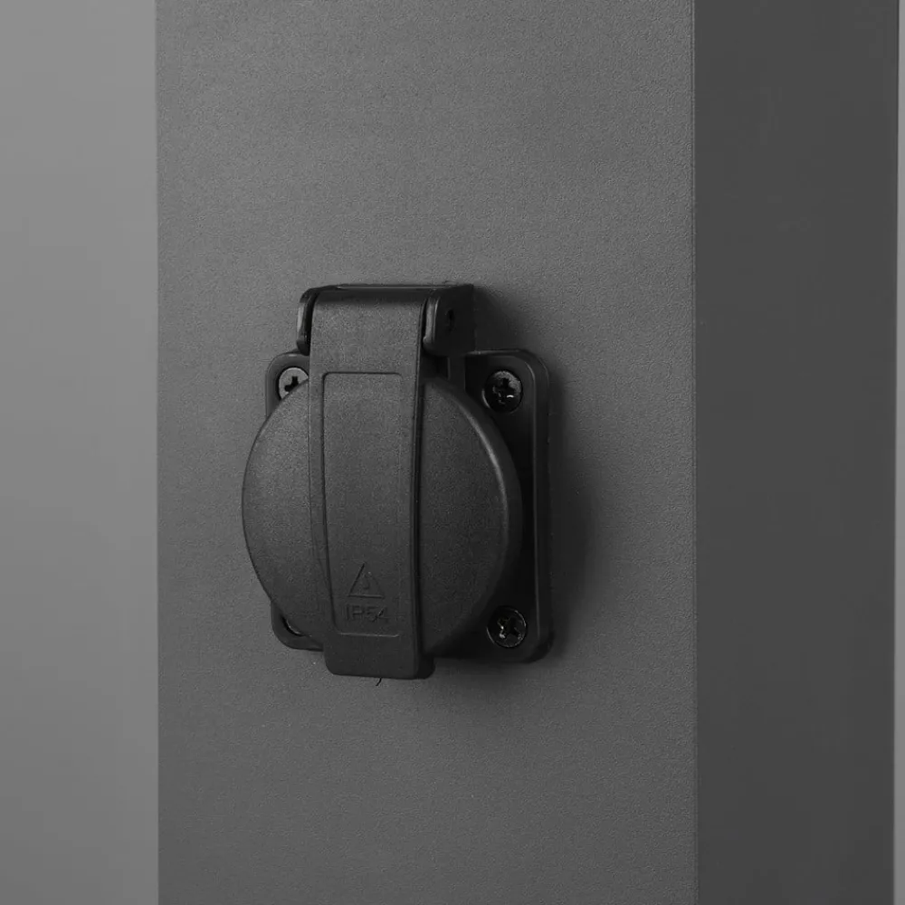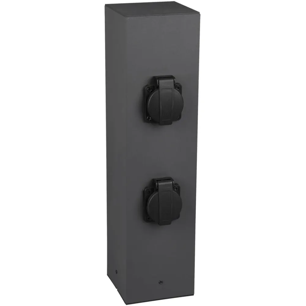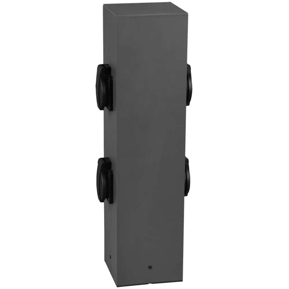 4-veis stikkontaktsøyle Pullerter for utendørs bruk Stikkontaktsøylen i metall har fire stikkontakter med beskyttelsesklaffer (2 x 2 på hver side) for forsyning av elektrisk utstyr utendørs. Søylen har et visuelt nøytralt, kubisk design i mørk antrasitt – Kapslingsklasse: IP44 – Maksimal samlet effekt for de betjente apparatene: 3600 W, 16 A