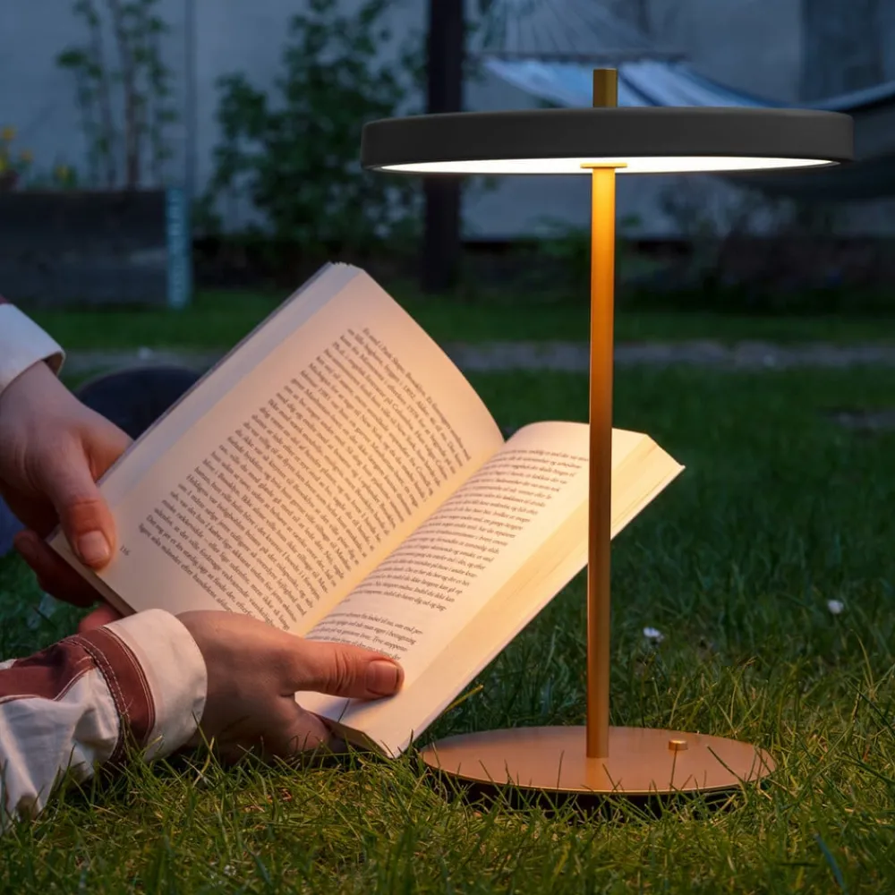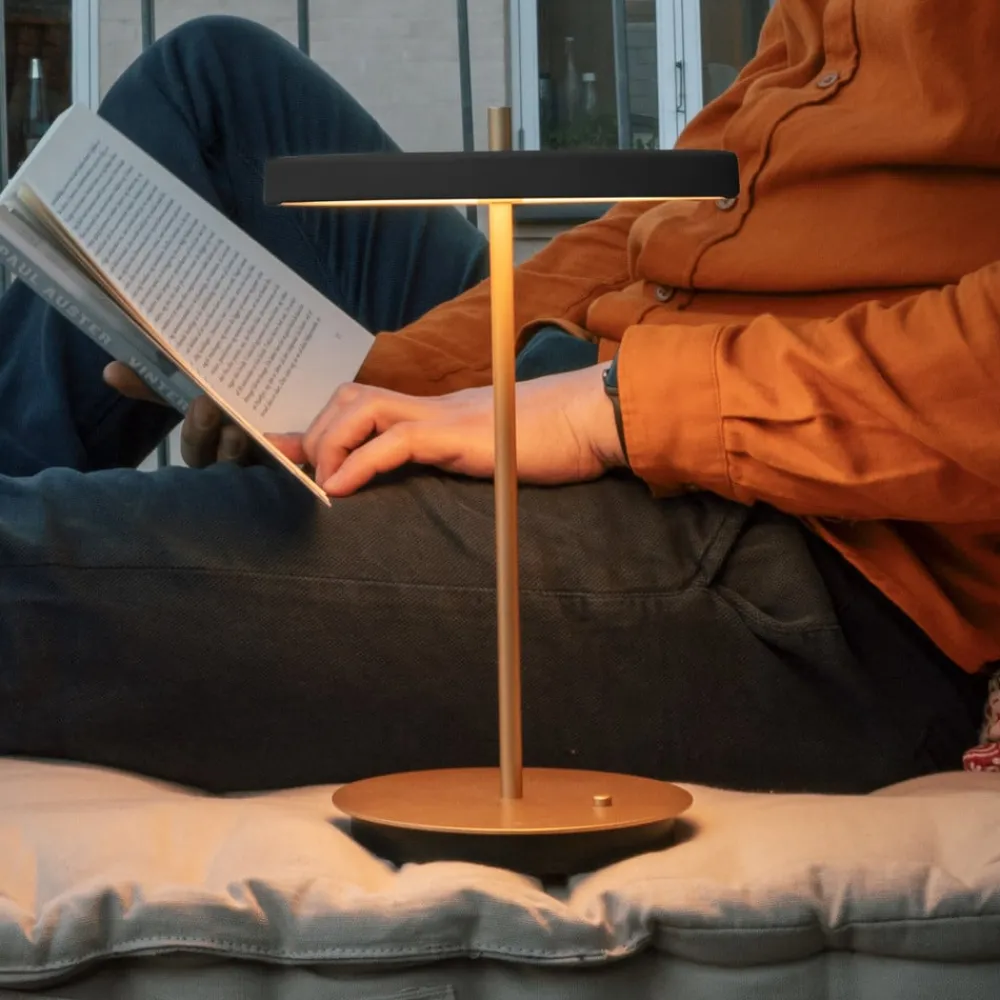 LED-bordlampe Asteria Move med oppladbart batteri for bærbar funksjon Grasiøs og utstyrt med utrolig bevegelsesfrihet, LED-bordlampen Asteria Move fra det danske designhuset UMAGE kan brukes hvor som helst i hjemmet. Takket være det innebygde litium-ion-batteriet kan lampen lyse i opptil 35 timer i gjennomsnitt uten strømtilkobling. Batteriet kan lades via en USB-C-kabel. Den runde lampeskjermen har varmhvite LED-lamper som avgir et koselig og behagelig lys som er blendfritt, mykt og jevnt fordelt på alle sider takket være den integrerte diffusoren. Berøringsdimmeren på den runde, massive sokkelen gjør det mulig å dimme lyset til fire ulike lysstyrkenivåer ved å trykke på bryteren flere ganger. Asteria-kolleksjonen er designet av medstifter og Chief Creative Developer, Søren Ravn Christensen. Designeren er selvlært og har en sjelden evne til å kombinere design og økonomi. Han sier om kolleksjonen: «Asteria-kolleksjonen, som er skapt i skjæringspunktet mellom design, teknologi og håndverk, har integrerte LED-lys i en slank, minimalistisk form.» Sammen med nåværende administrerende direktør, Jacob Nannestad Hansen, grunnla Christensen selskapet UMAGE by VITA copenhagen i 2008. Produsenten av designerlamper legger særlig vekt på bærekraftige materialer og teknologi av høy kvalitet i produksjonen av armaturene sine for å kunne tilby kundene størst mulig nytte. Konseptet er en suksess. I dag har det danske belysningsselskapet over 1500 filialer i mer enn 50 land over hele verden – bærbar – batteridrevet – lysstyrken kan justeres i fire nivåer: 1. nivå 5 lumen ca. 168 timer 2. nivå 20 lumen ca. 50 timer 3. nivå 50 lumen ca. 20 timer 4. nivå 100 lumen ca. 10 timer