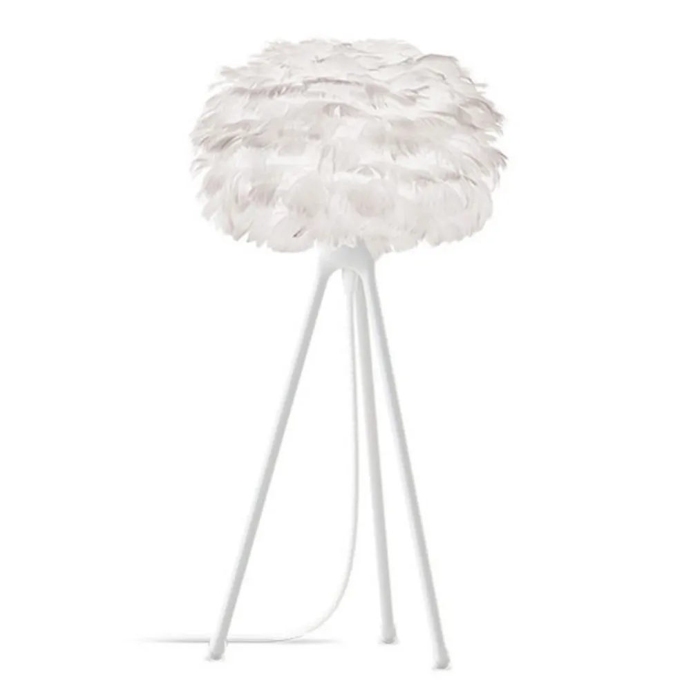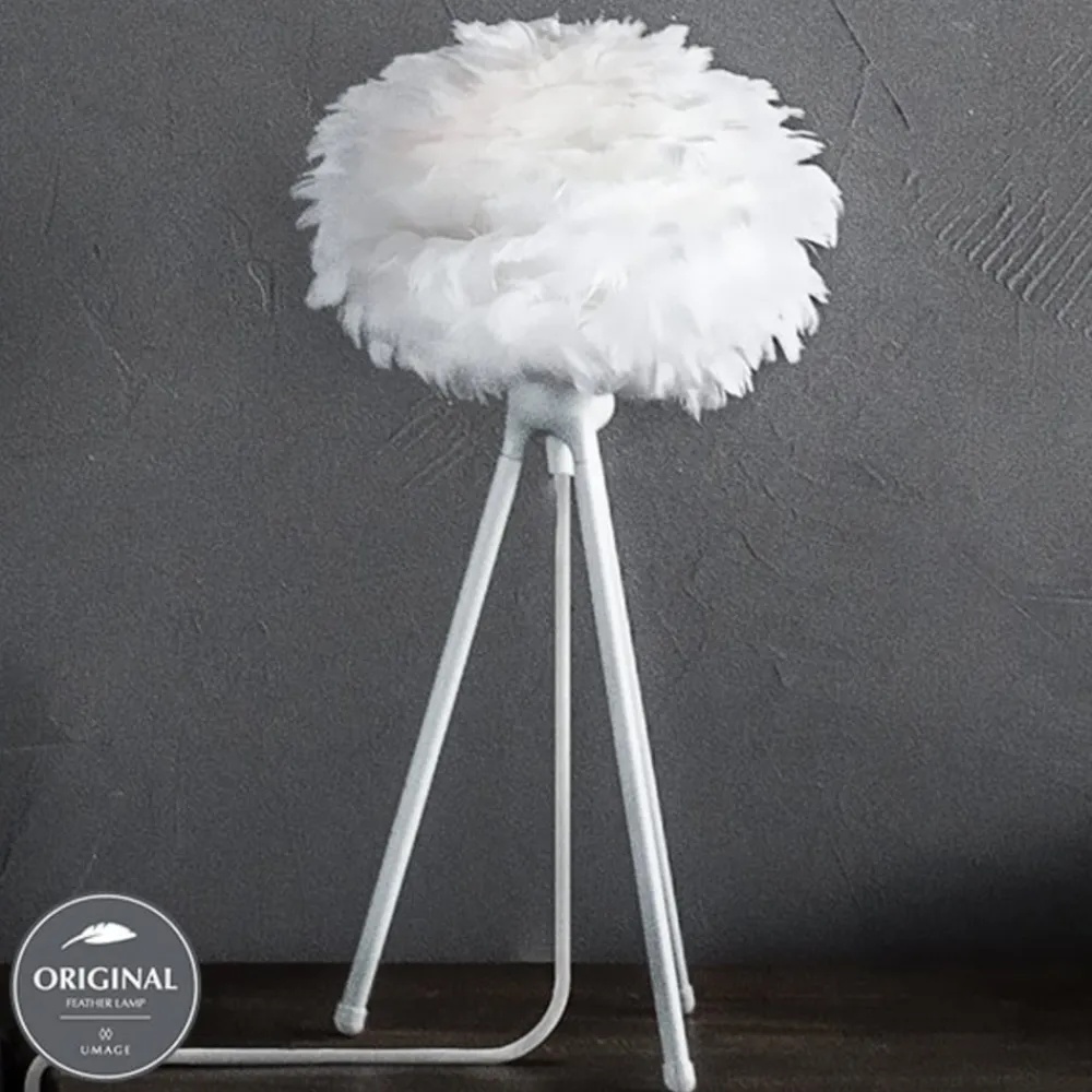 Denne lille bordlampen er med sin vakre fjærskjerm en dekorativ effekt i enhver stue, også uten belysning. Dette kommer av at det uvanlige skjermdesignet, som består av ca 500 ekte gåsefjær limt på en papirbunn, og den moderne lampefoten med tre bein harmonerer perfekt sammen. Begge komponentene er fra Søren Ravn Christensen, en av grunnleggerne av den danske lampeprodusenten UMAGE og som i sin tid var creative developer der.