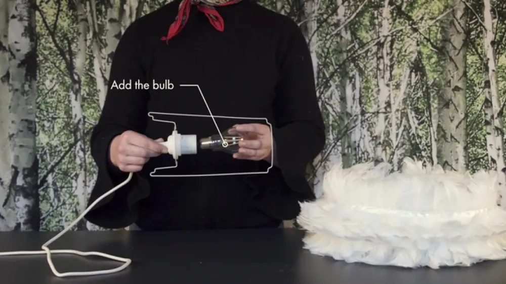 Skjermen til pendellampen Eos large er som en stor, lodden skulptur, som er laget av ekte gåsefjær. Ca. 4 500 ekte fjær ble limt til papirbunnen. Slik oppsto lampeskjermen, som skaper et utrolig lys, varmt, mildt og veldig hyggelig.