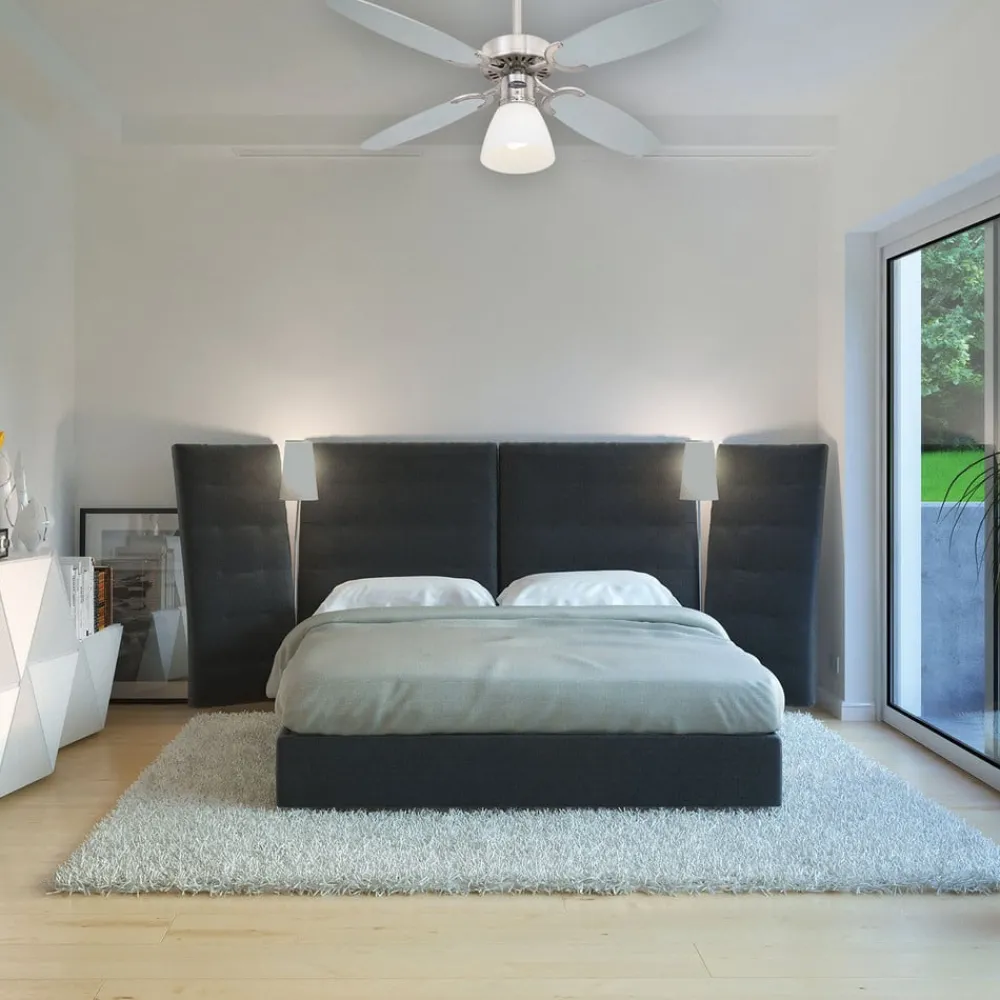 Ventilatoren Capitol med fire rotorer i flott design: Hus og motor er i børstet stål, rotorbladene kan vendes om og er svart på den ene siden og sølvfarget på den andre siden. Dermed kan de tilpasses personlig smak og innredningsstil. Med en diameter på 105 cm passer denne eksklusive ventilatoren i rom på inntil 15 m². Både sommer- og vinterdrift er mulig. Det betyr at rotorbladene går mot venstre i sommerdrift og sirkulerer luften slik at rommet kjøles ned. Høyrekjøringen om vinteren gjør at den varme fyringsluften som samles under taket omfordeles. Slik kan du spare energi (ca. 30 prosent) og redusere fyringskostnadene. Capitol har en trekkbryter og kan oppgraderes med en fjernkontroll eller veggbryter . Den formfine glasskjermen gir behagelig omgivelsesbelysning.