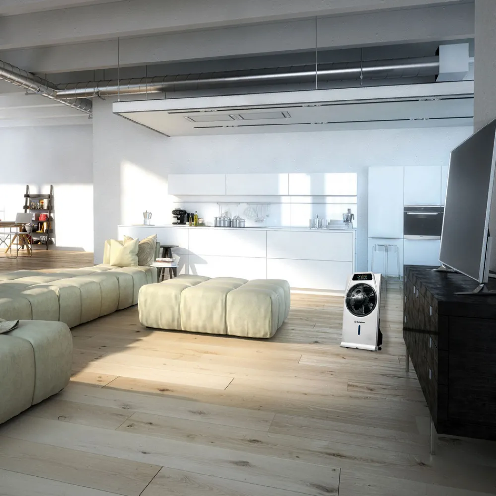 Ytelsessterk gulvvifte Cascate med integrert luftfukter.