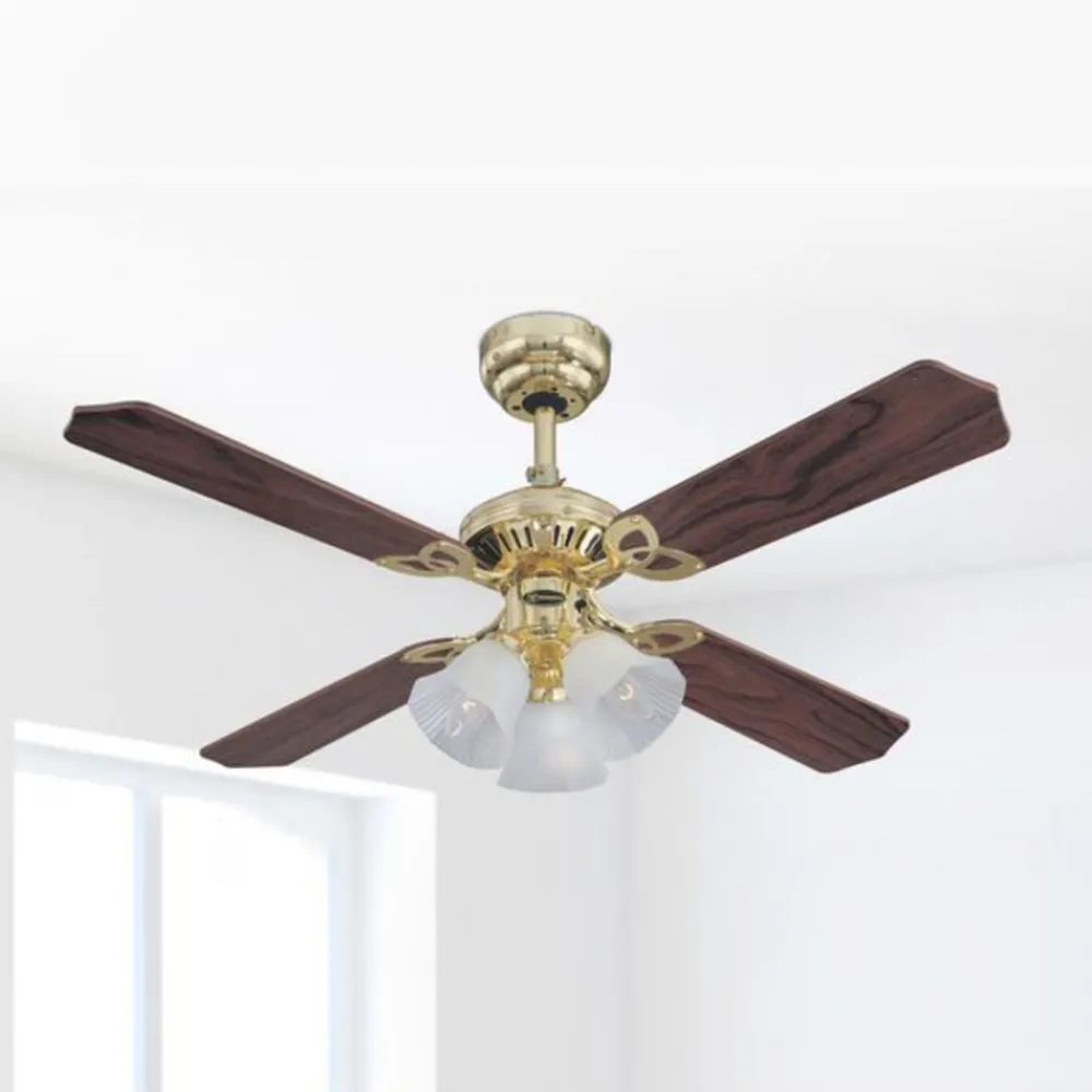 Stilig takvifte Princess Trio i tre- og rottinglook Den dekorative takviften Princess Trio imponerer med sitt elegante design med metallhus i polert messing. Viften har fire reversible blader med rottingapplikasjoner og et heltrekkende, fint treutseende i eik eller mahogny. De skaper en stilig atmosfære. Princess Trio-funksjonene er utstyrt med belysning: Tre fortryllende lampeskjermer i elegant satinert glass sørger for stemningsfull belysning. Lyskildene er ikke inkludert i leveransen. Den tretrinns viften kan betjenes med trekkbryteren. Hvis takhøyden er 350 cm eller mer, anbefales det å bruke et passende forlengelsesprogram (se tilbehør). Forover- eller reversfunksjonen – som kan justeres via den integrerte glidebryteren – brukes til å veksle mellom sommer- og vinterdrift. Sommerfunksjonen brukes til avkjøling i varmt vær, mens vinterfunksjonen bruker varmesirkulasjon for å spare opptil 30 % av oppvarmingskostnadene. Tekniske data Effekt: 45/32/23 watt Turtall: 210/145/85 o/min Spesielle egenskaper Takket være den ekstremt stillegående motoren er Princess Trio takvifte også egnet for bruk i soverom.