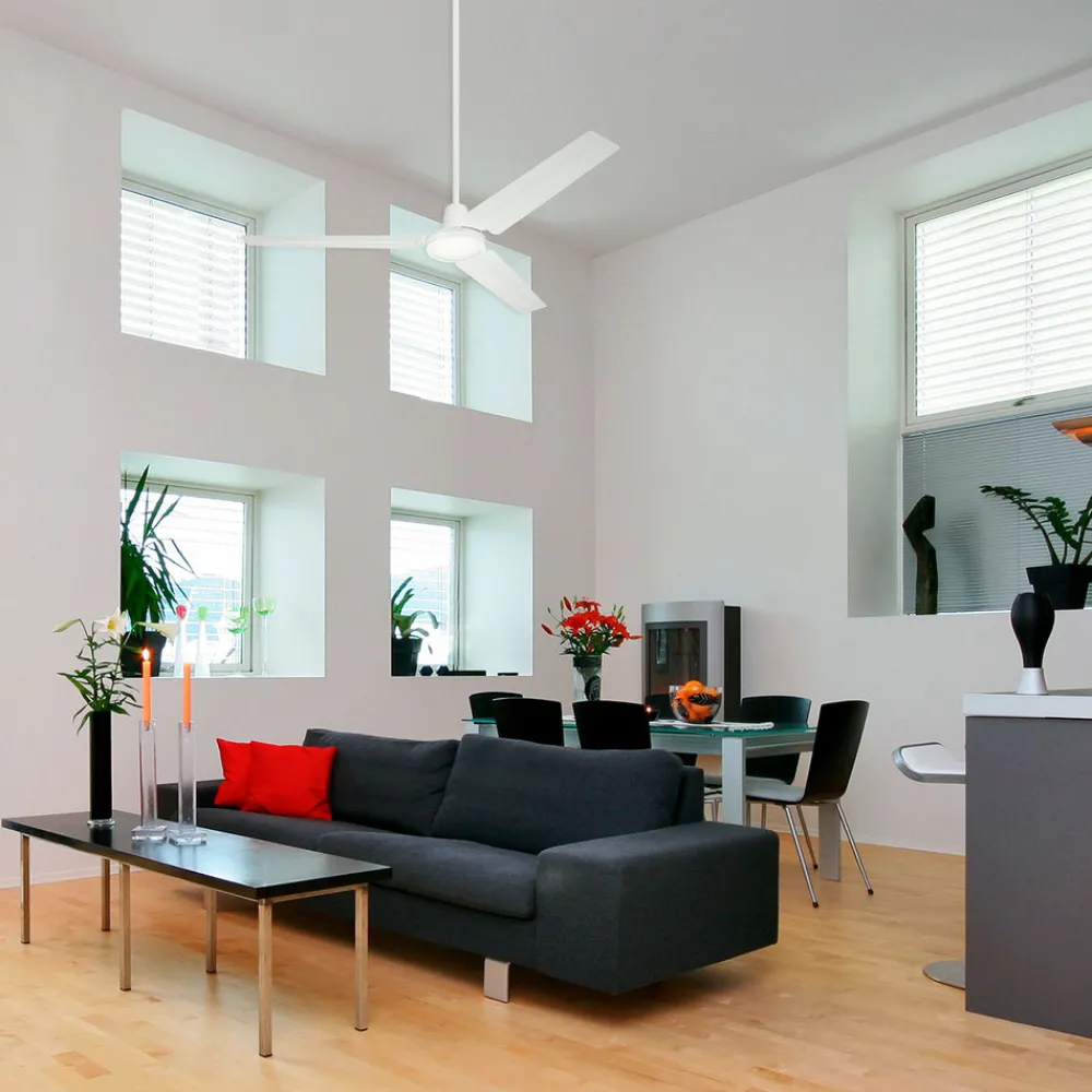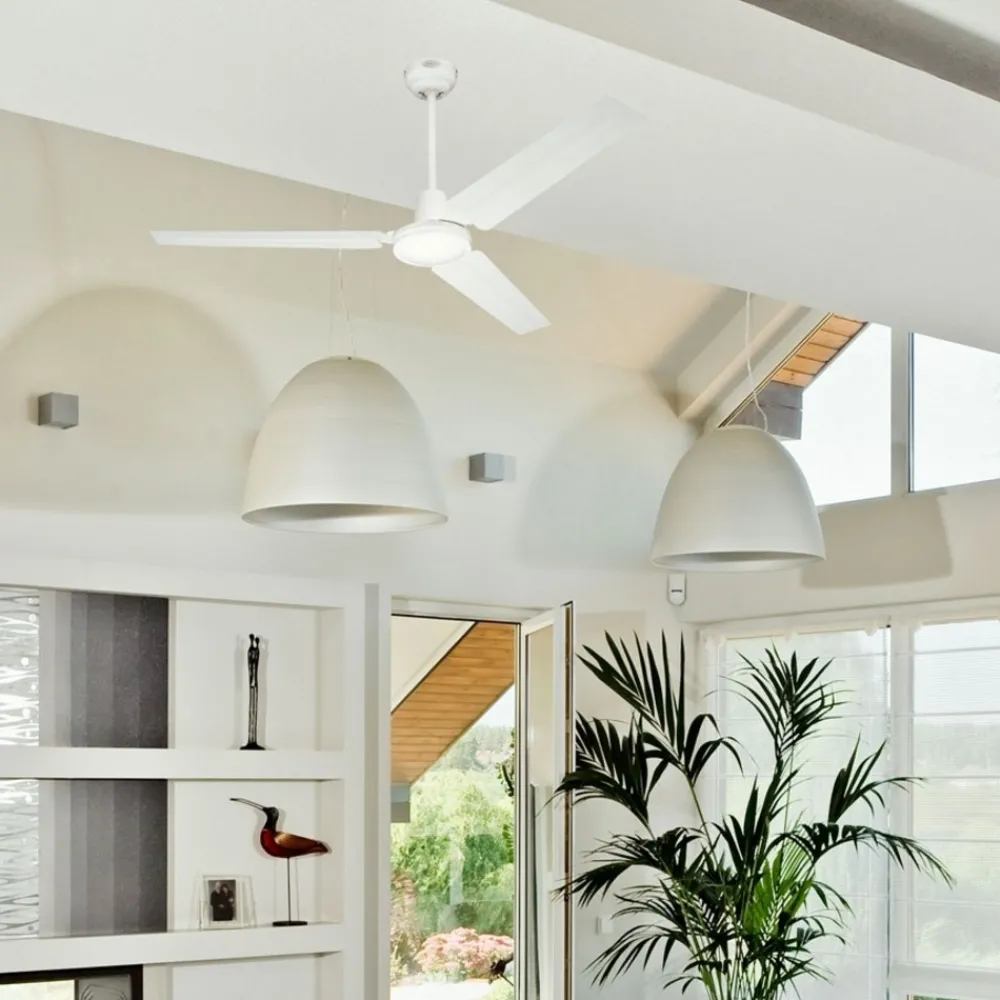 Enkel Industrial takvifte gir frisk luft Denne praktiske viften tilpasser seg uanstrengt til ethvert miljø takket være sin enkle design. Industrial takvifte er en ekte allrounder. Den kan ikke bare brukes på varme sommerdager, men også om vinteren. Funksjoner Hemmeligheten bak denne viften er at den har både forover- og bakoverfunksjon. På denne måten kan den på den ene siden tilføre frisk luft og på den andre siden fordele den varme oppvarmingsluften jevnt i rommet. Sistnevnte betyr at Industrial takvifte er perfekt for sparere. Viften er utstyrt med fire forskjellige hastighetsnivåer for ideell justering. Tekniske data Hastigheter: 90, 150, 210 eller 250 o/min Spesielle egenskaper Viften går svært stille og er derfor også perfekt til bruk på arbeids- eller soverommet. Viftens hastighet kan enkelt styres ved hjelp av en veggbryter som følger med i leveransen. Fjernkontroll kan ettermonteres (se tilbehør); det er ikke mulig å bruke veggbryter og fjernkontroll samtidig, bare ett kontrollalternativ kan installeres om gangen.