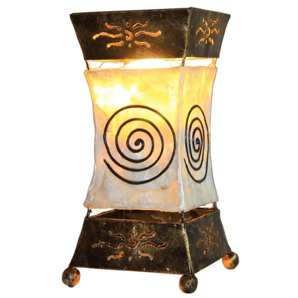 Den lille bordlampen Xenia er håndlaget på Bali og overbeviser først og fremst med sitt spesielle, eksotiske utseende. Den kantede lampekroppen er laget av metall og dekorert med kunstneriske solsymboler. I midten er lampeskjermen laget av kunstharpiks med et spiralmønster. Når Xenia-bordlampen er slått på, gir den et varmt og behagelig lys som egner seg godt som stemningsfull bakgrunnsbelysning. De små, runde føttene sørger for at den står godt, samtidig som de avrunder bordlampens vellykkede helhetsinntrykk og gjør den til et imponerende tilbehør til hjemmet.