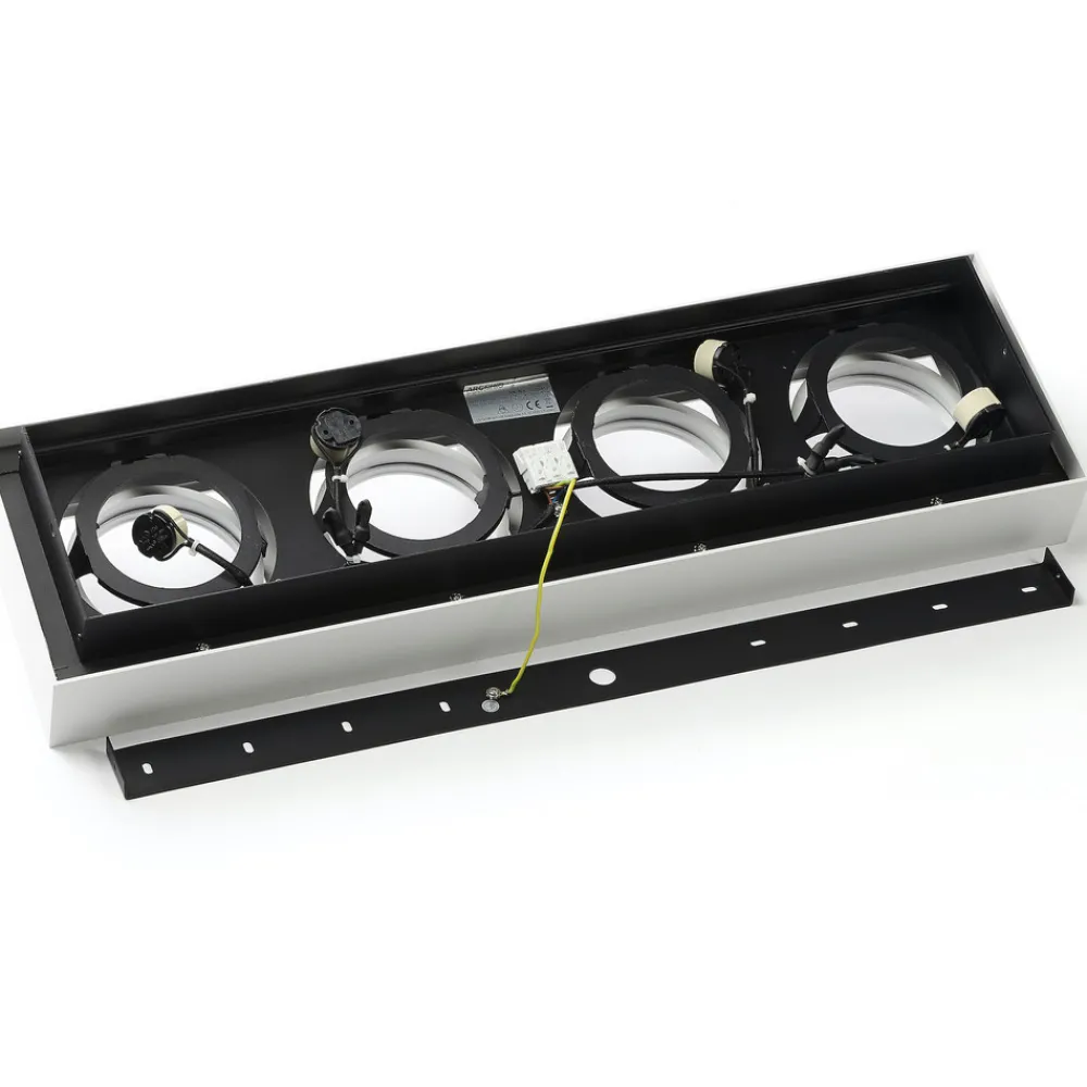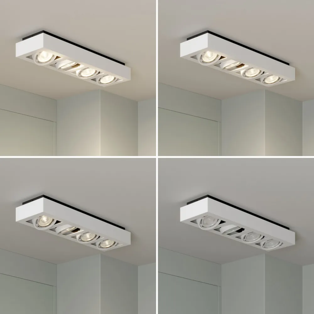 Avlang, 4 lyskilder Ronka taklampe for GU10-lamper Ronka passer både til private områder – som kjøkken, korridorer og arbeidsrom – og til næringsbygg, der downlighten for eksempel kan brukes som butikkbelysning. Lampene kan svinges etter behov, ettersom innsatsene er bevegelige, og LED-taklampen er utstyrt med en skruefri tilkoblingsklemme som muliggjør rask og verktøyfri montering. Den hvite overflaten har et behagelig tidløst utseende, og helhetsinntrykket er preget av et funksjonelt og minimalistisk uttrykk.
