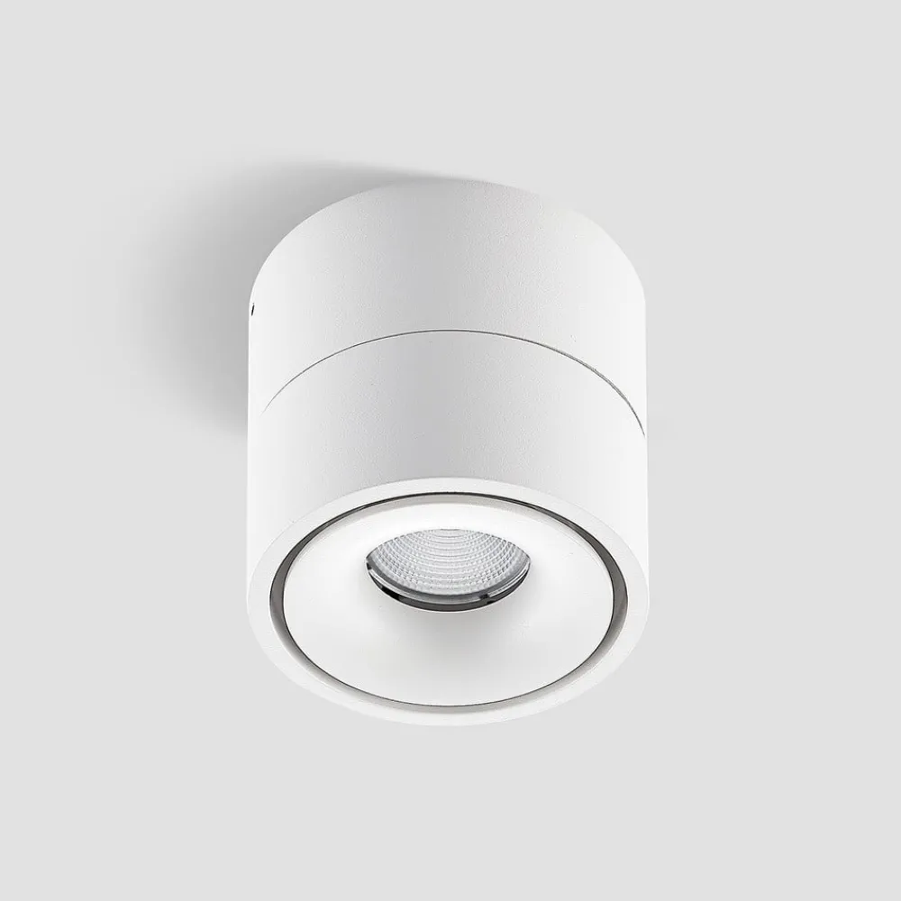Roterende og svingbar Rotari LED-takspotlight i hvitt Den lille Rotari LED-takspotlighten imponerer med sitt moderne design og fleksible belysningsalternativer. Armaturhodet kan ikke bare dreies 350°, men også svinges 90°. Armaturhuset i aluminium er utstyrt med en innebygd reflektor som har en strålevinkel på 34° og beriker rommet med varmhvitt lys (3000 K). Armaturens lysstyrke kan ved behov justeres ved hjelp av en forkant- eller bakkantfasedimmer og har en CRI-verdi > 90. Driveren er integrert i armaturhuset.