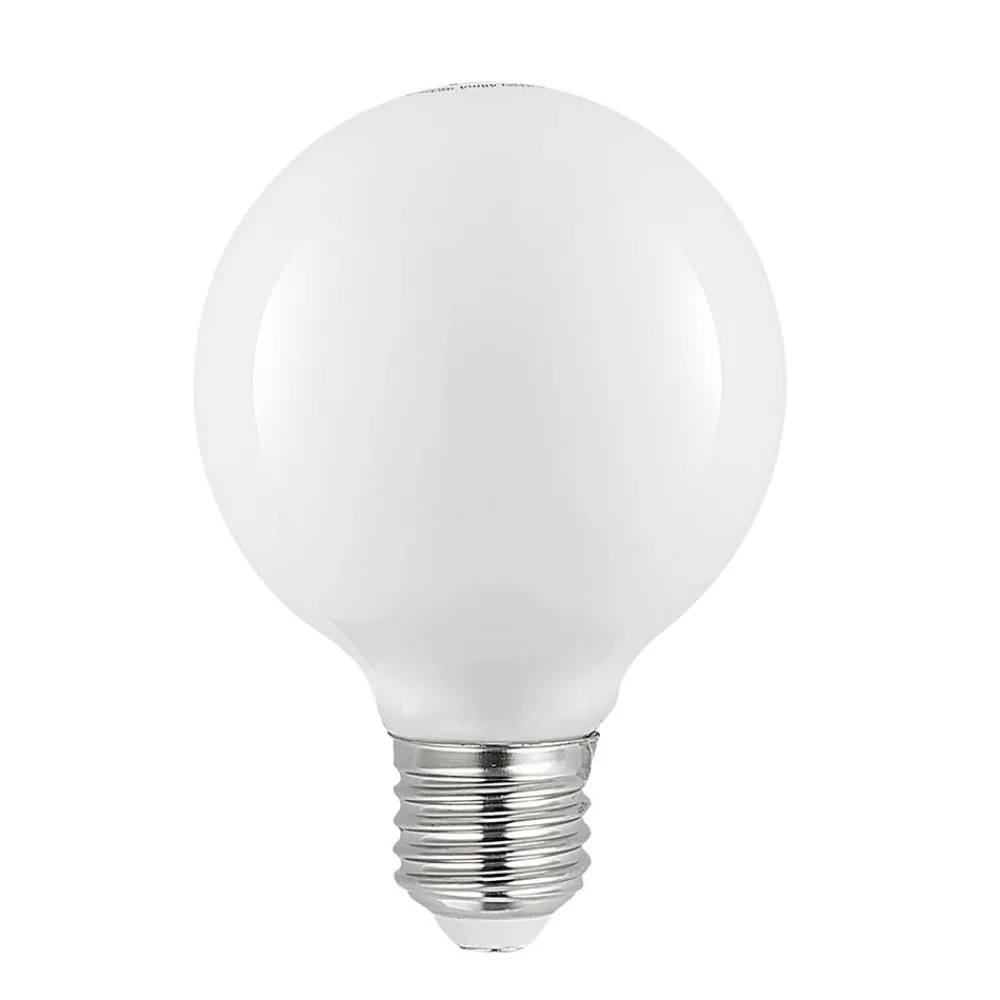 LED-globepære G80 E27 8 W, opalhvit, med varmhvit lysfarge (2 700 K) Denne LED-pæren har samme lysstyrke som en vanlig glødepære med et strømforbruk på 70 W. Den opalhvite overflaten forhindrer blending – Dimbar med faseavsnittdimmer i forkant og faseavsnittdimmer i bakkant