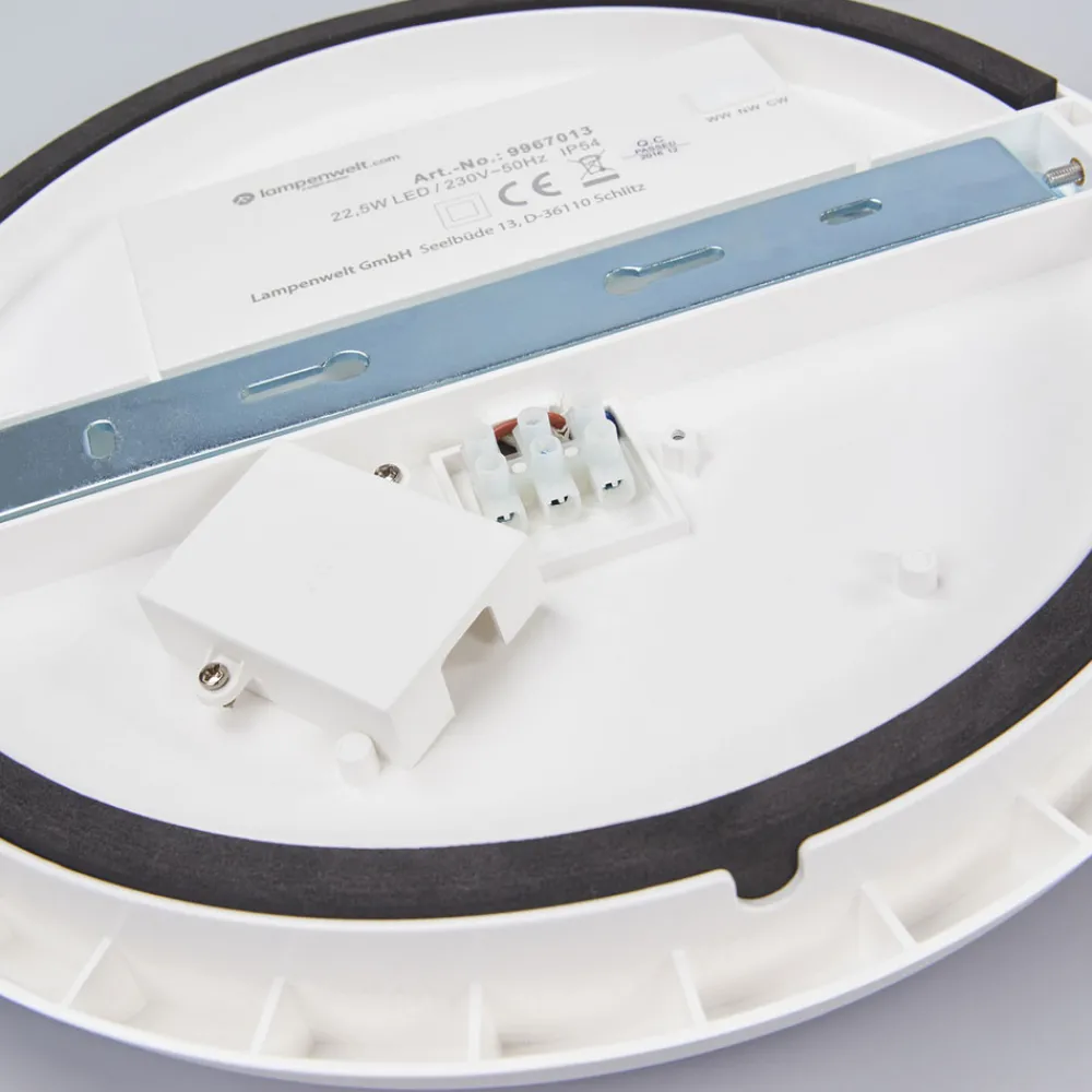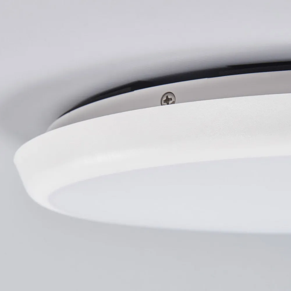 Rund LED-taklampe Augustin med høy lysstyrke og kapslingsgrad IP54, valgbar lysfarge Augustins runde ramme er hvitlakkert, mens polykarbonatskjermen med sin hvite overflate skaper en god og jevn lysspredning. Alt i alt er utseendet behagelig enkelt og tidløst, og derfor kan LED-taklampen til våtrom også brukes i et førsteklasses teknisk miljø. LED-lampene skaper et energieffektivt lys som gir både sterk lysstyrke og lavt strømforbruk. Lysfargen er variabel, og du kan velge mellom tre fargetemperaturer. Til dette formål betjenes en bryter på baksiden av armaturen før LED-taklampen monteres, som kan skiftes i tre trinn.