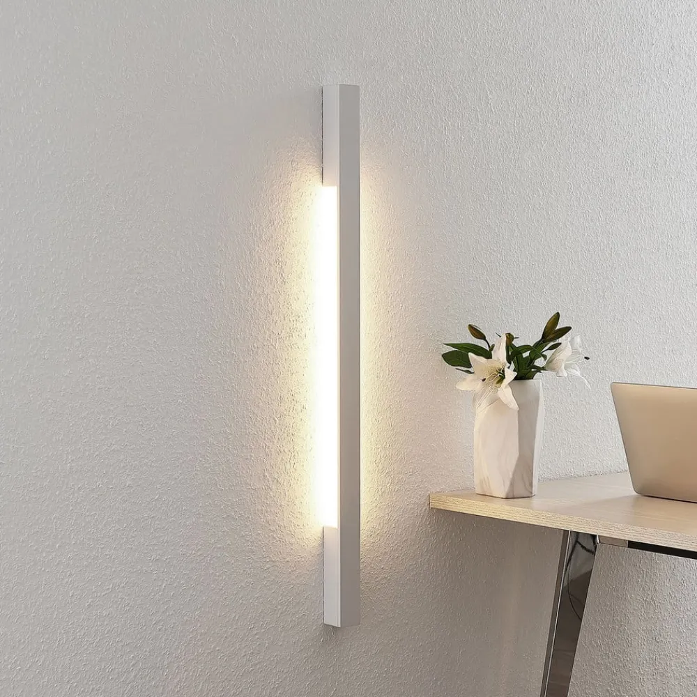 Hvit Ivano LED-vegglampe med slank design Ivano LED-vegglampen har ikke bare et kompakt utseende, men det subtile fargevalget gjør den også til den perfekte følgesvenn når det gjelder aksentbelysning i gangen. Lampekroppen består av en lang armaturstang som er montert vertikalt på to veggfester. LED-lampene sitter bak armaturstaget og projiserer lyset sitt mot veggen og fremhever den med sitt eget lys. Den hvite fargen er diskret og perfekt for diskret belysning i en moderne stil. Den kompakte bredden på Ivano LED-vegglampen er ideell for trange rom og sparer mye plass sammenlignet med voluminøse vegglamper. Med sitt utseende passer den perfekt inn i en moderne innredningsstil uten å overdøve de andre møblene.