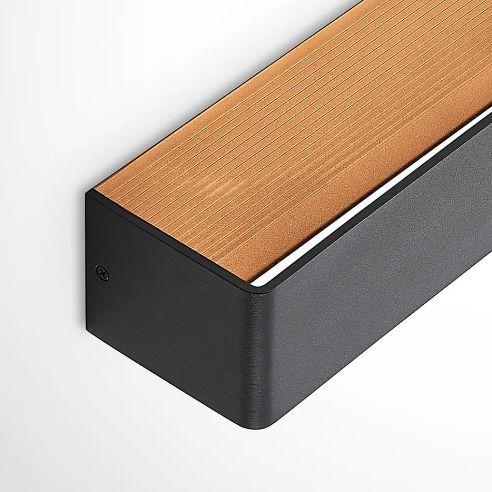 Rette linjer i svart og gull: LED-vegglampen Karam med lysutslipp oppover og nedover Huset til Karam vegglampe er svært enkelt og består av et frontpanel som sørger for at lyset bare sendes oppover og nedover. Dette skaper vakre lysforhold som på sin egen måte bidrar til en koselig romatmosfære og inviterer til velvære. I en gang, som vanligvis har funksjon som en passasje, er denne LED-vegglampen en god måte å gi orienteringsbelysning på, men en slik koselig belysning blir også alltid satt pris på i en stue eller et soverom. God belysning og lavt strømforbruk går hånd i hånd, noe som gjør Karam til en effektiv armatur. Utsiden av den langstrakte, kantete skjermen er matt svart, mens Karam har en varm gullfinish på innsiden, noe som ikke bare skaper en trendy, men harmonisk kontrast, men også påvirker lyseffekten når lyset sendes ut på en så vakkert varm og innbydende måte.