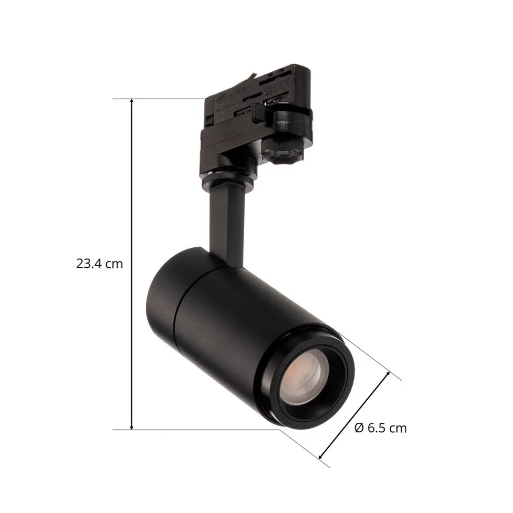 Svart Nanna LED-skinnespotlight – justerbar strålevinkel, for 3-fase skinne, roterbar og svingbar Denne skinnespotlighten er kompatibel med standard 3-fase skinnesystemer og kan brukes både privat og kommersielt. Den sylindriske LED-skjermen har et aluminiumshus i svart og en innvendig linse som kan justeres fra 15°, som er ganske smalt og spotlight-aktig, for å skape et punktformet lys, til 60°, som tilsvarer et bredere lys for å belyse et litt større område. Det er små markeringer på spotlighten for korrekt innstilling av vinkel, og spotlighten egner seg svært godt til profesjonell belysning av kommersielle lokaler, der de variable justeringsmulighetene kan brukes til å skape en tilpasset lyssituasjon, spesielt fordi selve spotlighten også kan roteres og svinges.