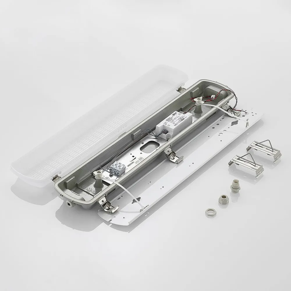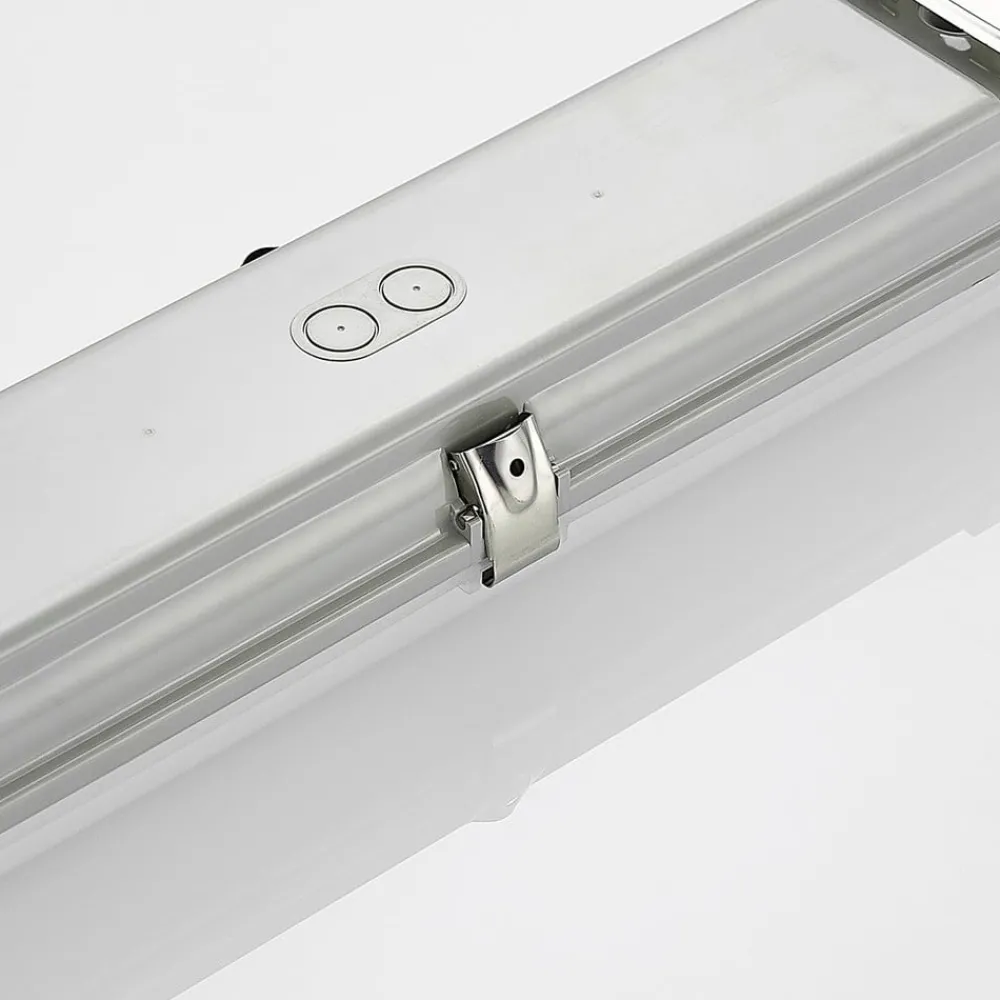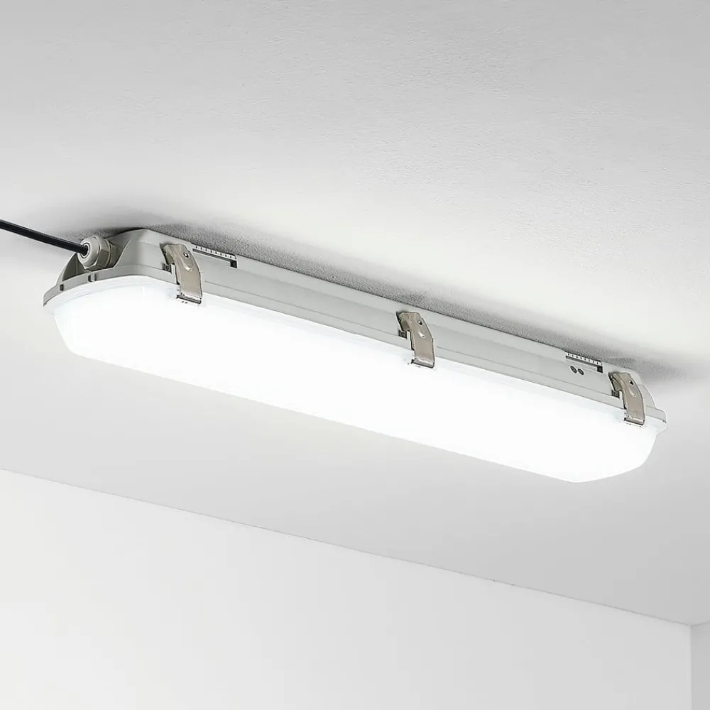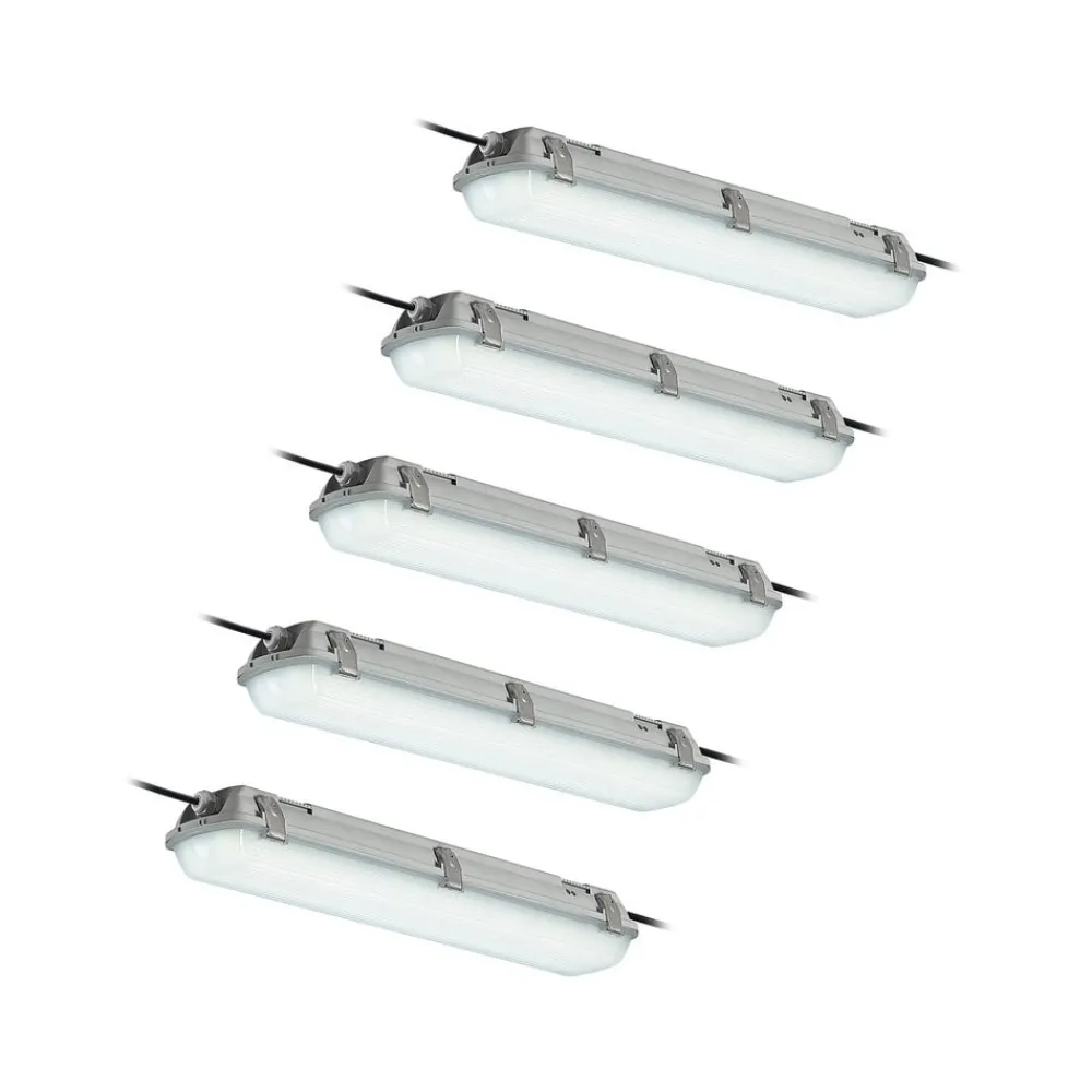 Rao utenpåliggende LED-spredningslys for bruk i fuktige rom, IP65, valgbar lysfarge Dette utenpåliggende LED-spredningslyset er en virkelig ressurs når det gjelder god belysning, spesielt i kommersielle områder eller i fuktige rom rundt hus og hage, for eksempel i garasjen eller kjelleren. Med sin høye kapslingsgrad kan smuss og fuktighet knapt skade diffusorlyset, og det er derfor også egnet for rom der luftfuktigheten kan være høyere. LED-lampene er spesielt effektive og gir tilstrekkelig lysstyrke med forholdsvis lavt strømforbruk. Lyset er flimmerfritt, og før installasjon kan du velge mellom tre lysfarger, som kan velges ved hjelp av den integrerte DIP-bryteren. Takket være den høye slagfastheten er Rao en spesielt robust armatur – Mulighet for gjennomgående kabling – IK08-slagfasthet – SDCM < 5 – Leveres i et praktisk sett med 5 stk