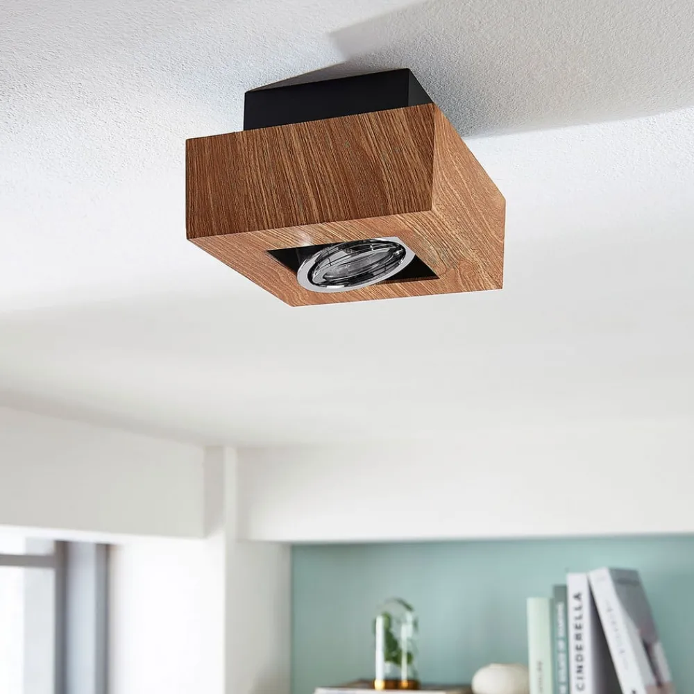 Vince taklampe i metall med tredekor Denne taklampen med GU10 fatning har en kompakt design og en firkantet grunnform. …