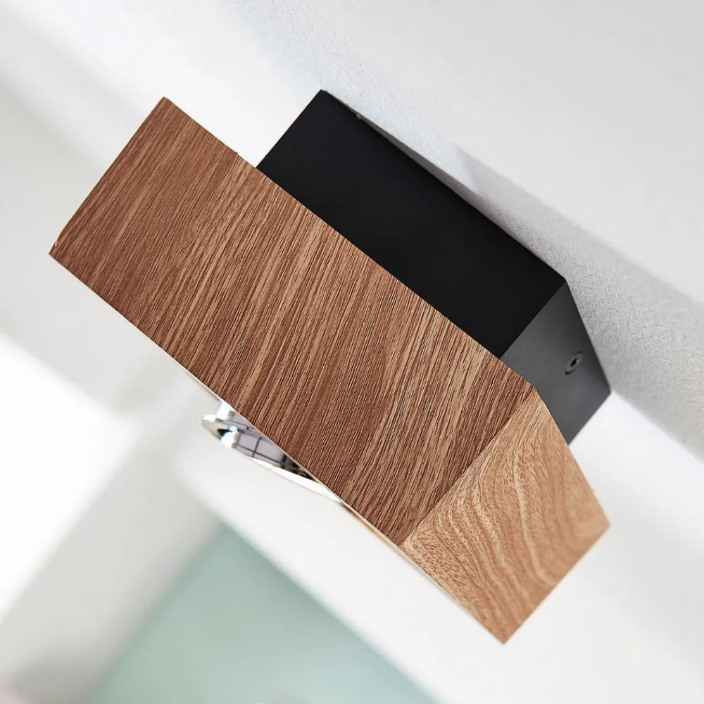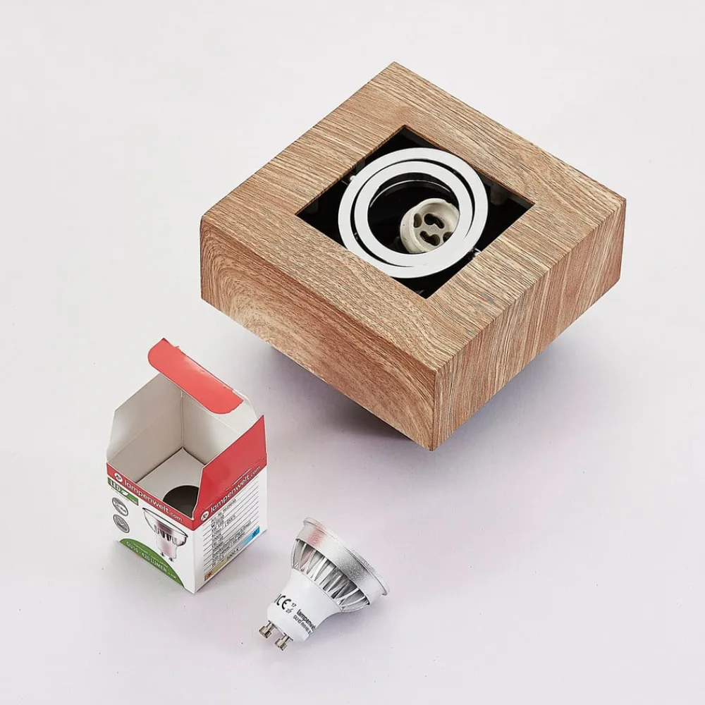 Vince taklampe i metall med tredekor Denne taklampen med GU10 fatning har en kompakt design og en firkantet grunnform. Den innvendige lyskildeinnsatsen kan svinges, slik at man kan endre retningen på lysstrålen. Tredekoren på metallrammen gir armaturen et naturlig utseende, mens en skrueløs klemme forenkler installasjonen av taklampen.