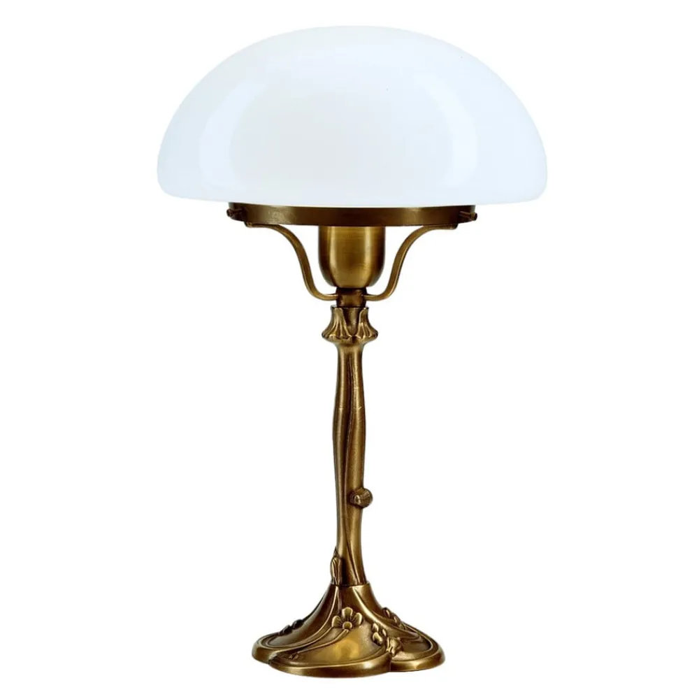 Klassisk bordlampe Katharina med halvkuleformet skjerm Bordlampen KATHARINA har et klassisk design. Den er lånt fra en modell fra begynnelsen av 1800-tallet og skaper dermed en nesten verdig atmosfære. Den nesten halvkuleformede glasskjermen er munnblåst og montert på en sokkel av berlinermessing. Dette er en overflatebehandling som gir messingen en umalt patina. Dette gir en lettstelt og ufølsom overflate som kun bør rengjøres med en myk klut.