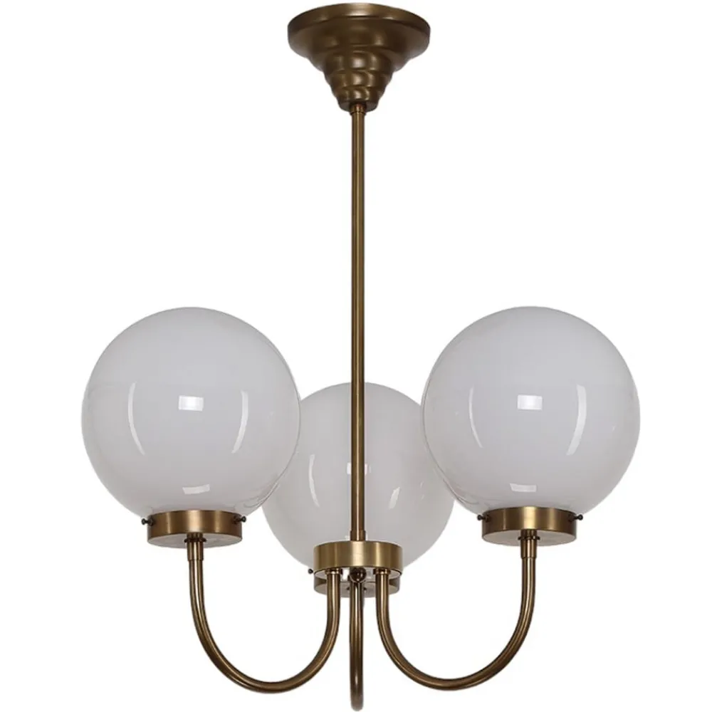 Denne lysekrone med tre flammer tilbyr et klart designspråk. Paraplyene bæres av metallarme, som dukker opp i en U-form under sentralholderen. Det opalhvite, blanke glasset i nyanser gir et behagelig, blendfritt lys. Finishen av rammen av messing fra Berlin oppnås i en kompleks prosess ved hjelp av en patina farget i messingen.