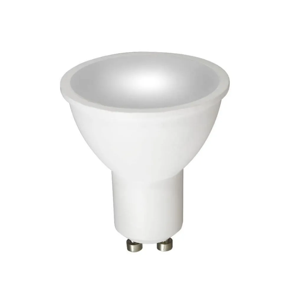 LED-reflektorpære GU10 5 W med bred strålevinkel på 120° Denne LED-reflektorpæren sender ut lys i en vidvinkel på 120°. Den kan brukes som erstatning for halogenreflektorpærer med 50 W i eksisterende spotlights. Funksjoner/egenskaper – Sammenligningsverdi for halogenpære 50 W – Svært koblingsbestandig med opptil 100 000 koblingssykluser – Lang levetid på opptil 30 000 timer