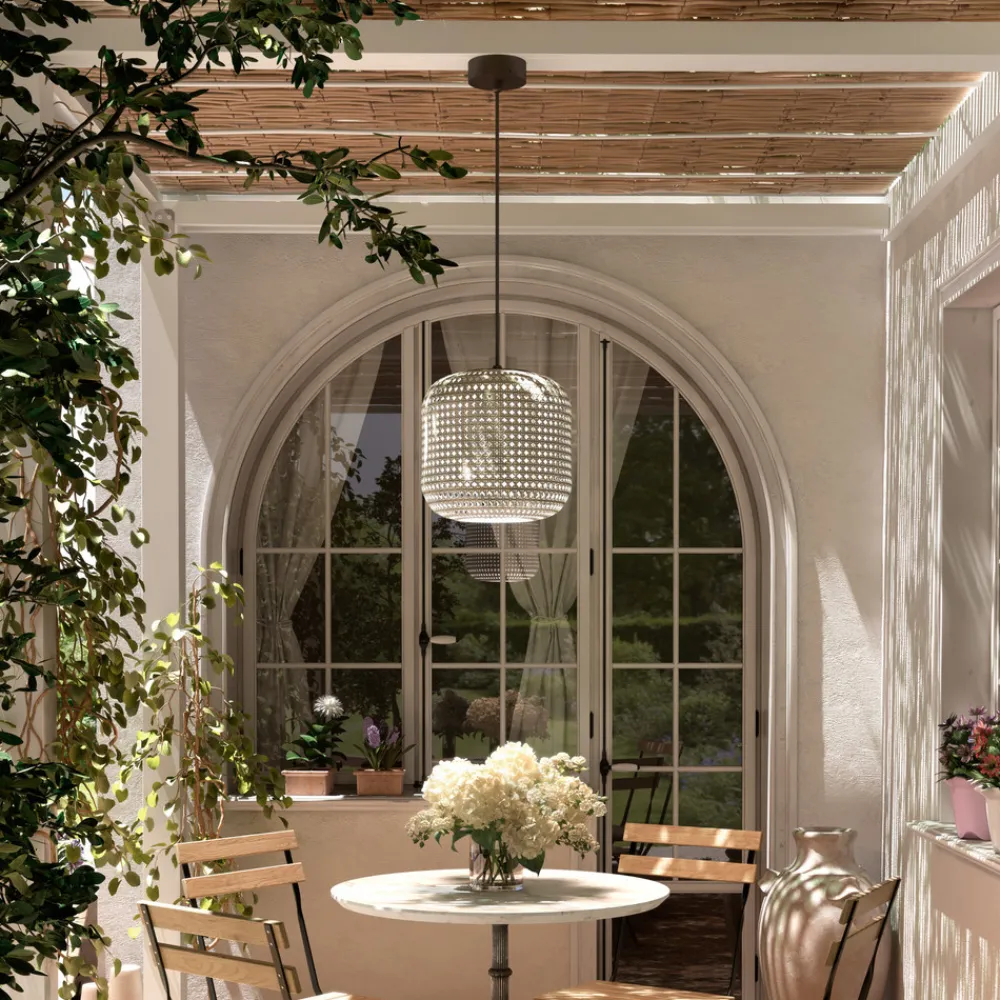 Designer utendørspendellampe Nans A med vevd skjermDesignfirmaet Bover, som holder til i Barcelona, legemliggjør middelhavsstilen med sine Made in Spain-produkter. Pendellampen Nans er designet for utendørs bruk, men kan også brukes innendørs. Den sylindriske lampeskjermen er vevd av syntetisk fiber, der tråder i ulike farger er flettet inn i hverandre. Pendellampen er triac-dimbar, men dimmeren er ikke inkludert.