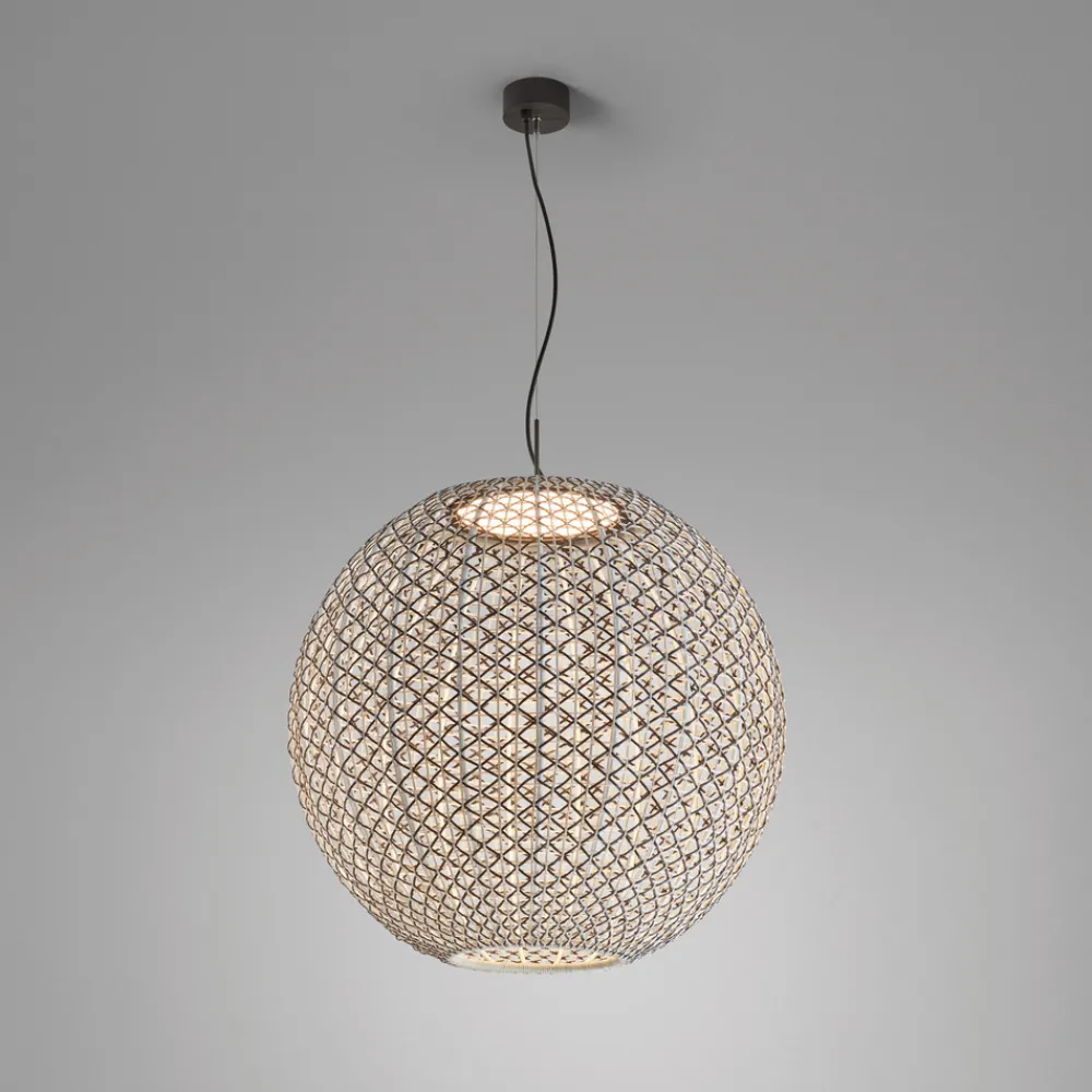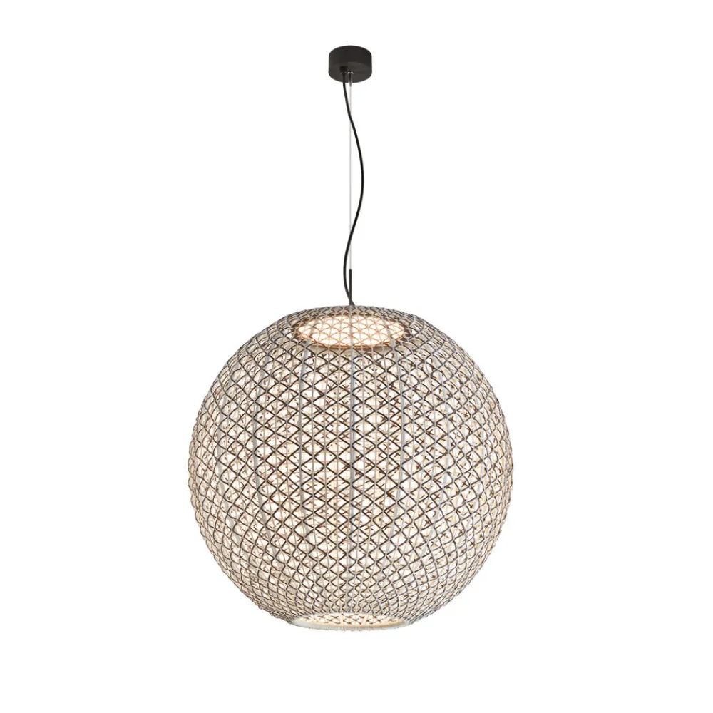 Designer utendørspendellampe Nans Sphere S med vevd skjermDesignfirmaet Bover, som holder til i Barcelona, legemliggjør middelhavsstilen med sine Made in Spain-produkter. Pendellampen Nans Sphere er designet for utendørs bruk, men kan også brukes innendørs. Den kuleformede lampeskjermen er vevd av syntetisk fiber, der tråder i ulike farger er flettet inn i hverandre. Pendellampen er triac-dimbar, men dimmeren er ikke inkludert.