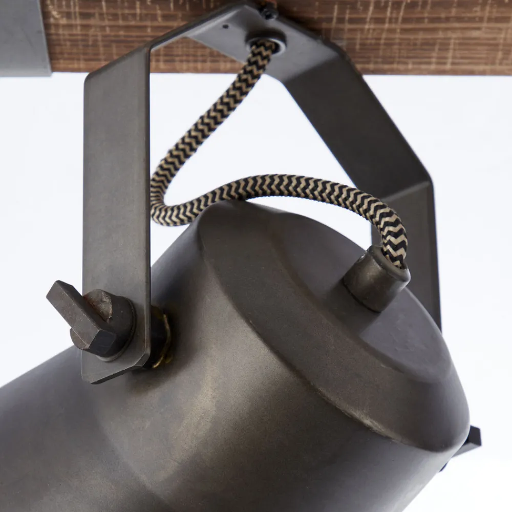 Denne kompakte taklampen har to svingbare spotter for optimal belysning av rommet. Tre- og stålelementer er vevd inn i et helhetlig konsept som utstråler industriell sjarm.