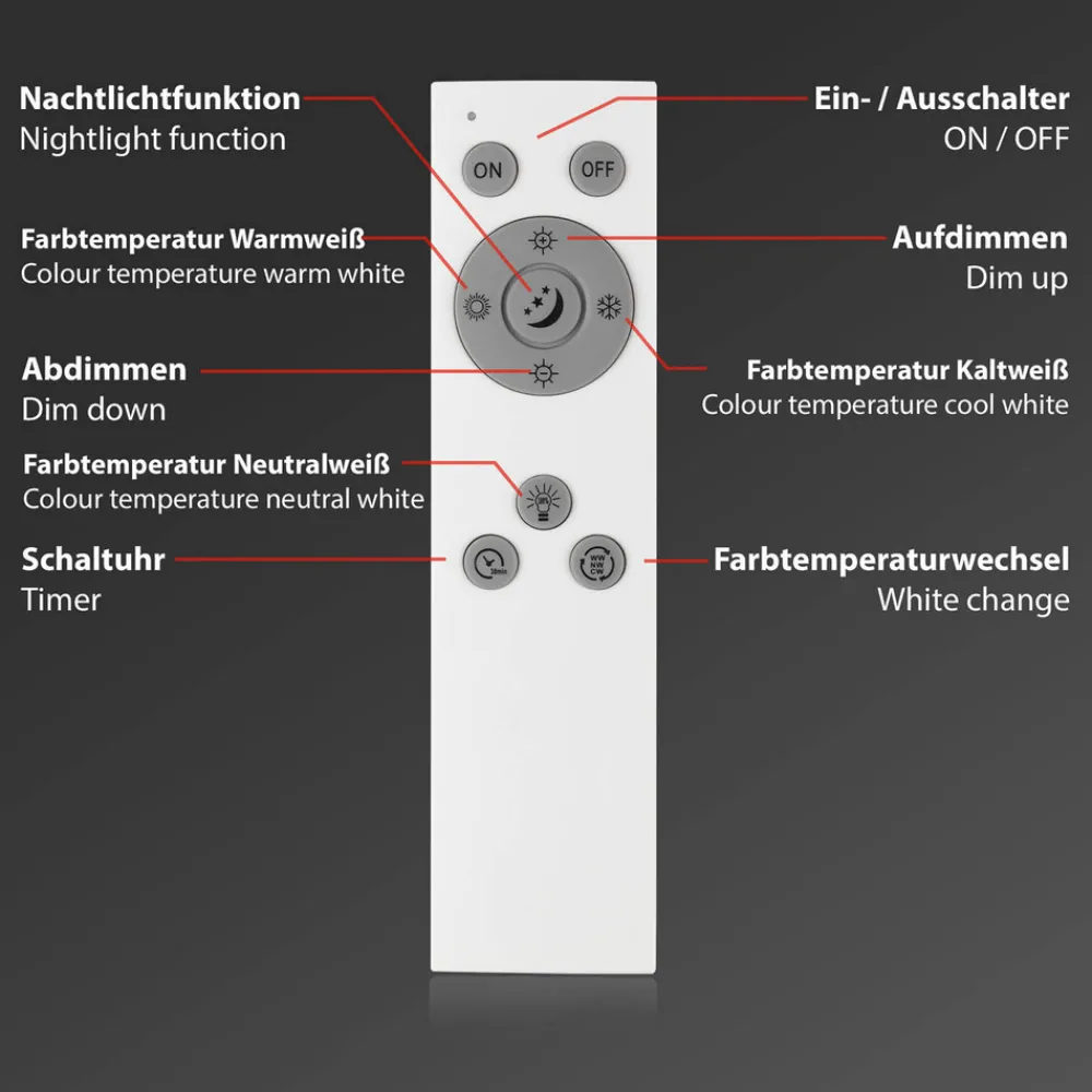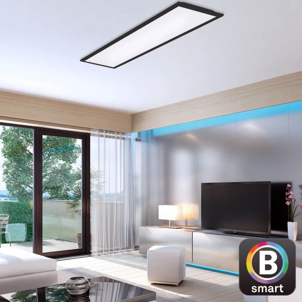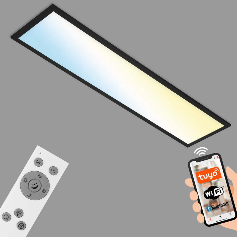 Smart Piatto S LED-taklys – kan styres ved hjelp av fjernkontroll, mobiltelefon eller taleassistent Det rektangulære og ultraflate Piatto S LED-panelet leveres med en fjernkontroll, som lysstyrken kan dimmes med og lysfargen kan være justeres kontinuerlig fra varmhvitt til dagslyshvitt. Den integrerte timerfunksjonen, nattlysfunksjonen og minnefunksjonen kan også styres via fjernkontrollen eller kan, takket være WiFi + Bluetooth, betjenes via gratisappen med mobiltelefon eller via taleassistent. Designet på lampen holdes rett, slik at Piatto S enkelt kan integreres i rom med moderne innredning. – kompatibel med Google Home og Amazon Echo for intelligent stemmestyring – kontrollerbar via WiFi-basert app (gratis for iOS og Android) – lyse farger og lysstyrke kan justeres via app