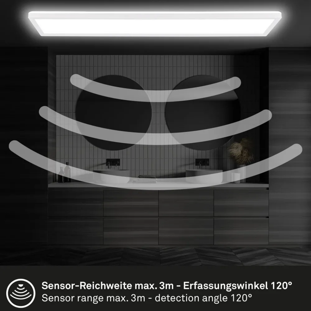 Move LED-panel: sensoraktivert lys for bad og korridorer Move LED-panelet imponerer med sin sensoraktiverte belysning, som er spesielt utviklet for bruk på bad og i korridorer. Med kapslingsgrad IP44 gir det pålitelig beskyttelse mot vannsprut og er derfor ideelt for fuktige miljøer. Den integrerte LED-lyskilden sørger for jevn og effektiv belysning, mens den universalhvite lysfargen på 4000 K skaper en behagelig og funksjonell atmosfære. Move LED-panelet er laget av høykvalitetsplast i elegant hvitt og passer sømløst inn i ulike romgestaltninger. Den høye fargegjengivelsen på 80 Ra garanterer en naturlig og levende fargeskjerm som lyser opp rommet i et klart og tiltalende lys. Energisparende lys kombinert med LED-panel med lang levetid gjør dette panelet til et bærekraftig valg for moderne belysningsløsninger – med bakgrunnsbelysningseffekt – sensorrekkevidde 3 meter, registreringsområde 120°