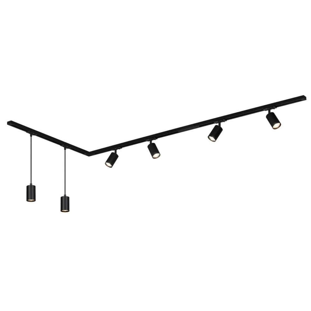 6 lyskilder skinnesystem med fire spotlights og to pendellamper Settet med 230V skinnesystem består av: – 4 spotlights med GU10 fatning – 2 pendellamper med GU10 fatning – 3 skinneskinner – 3 endestykker – 1 mater – 1 rett kontakt – 1 hjørnekontakt