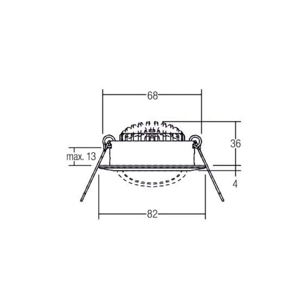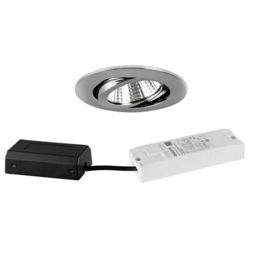 LED-innbyggingsspot BB03 med DALI-dimbar driver og koblingsboks Dette runde LED-innbyggingsspotsettet består av en spotlight med et armaturhode som kan vippes 30° i alle retninger, en DALI-dimbar LED-driver og en koblingsboks. Downlighten kan monteres uten verktøy ved hjelp av monteringsfjærer. Den er utstyrt med en sølvreflektor med dyp lysfordeling og en transparent polykarbonatavdekning – med elektronisk, DALI-2-dimbart forkoblingsutstyr – med koblingsboks – tillatt omgivelsestemperatur -20 til 25 °C – spredningsvinkel 38° – maks. taktykkelse 1,3 cm – uten deksel med varmeisolerende materiale