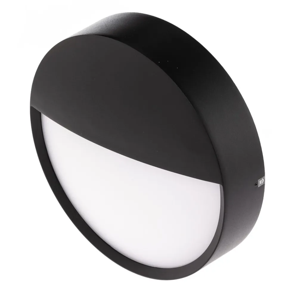 Sirkulær LED-vegglampe Eye med halvdekket skjerm I denne versjonen av Eye-vegglampen, som er egnet for utendørs montering, er den runde skjermen i hvit plast dekket i den øvre delen – som et øyelokk. Rammen er laget av aluminium med matt, svart overflate. Avhengig av behov og bruksområde kan fargetemperaturen til LED-lyset stilles inn på 3000 K, 4000 K eller 5700 K før montering. – Forkoblingsutstyr inkludert – Fargetemperatur kan velges før montering