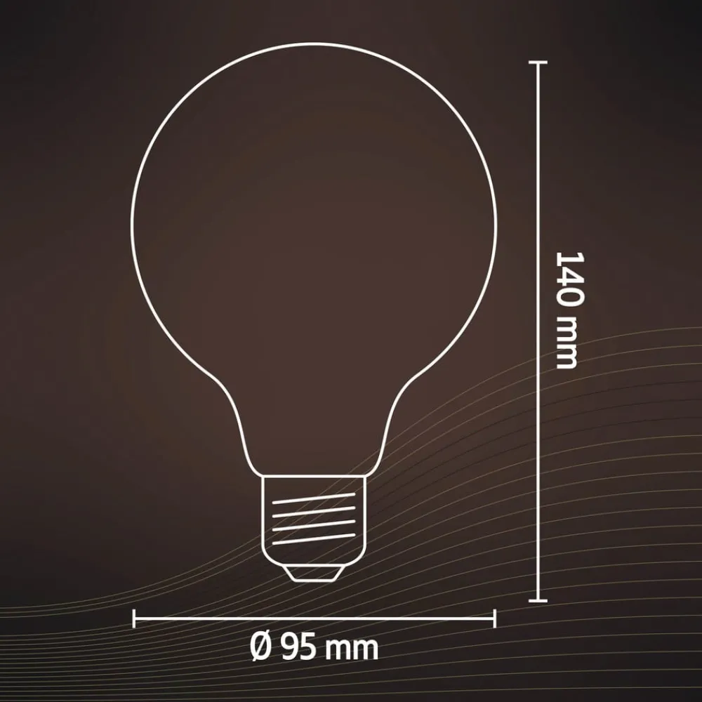 LED globe lampe E27 G95 4,5W 2.100K gull dimbarI det gullfargede glasset til denne LED globe lampen er rette LED glødetråder dekorativt arrangert. De avgir et ekstremt varmt lys på 2100K. I ubeskyttede armaturer i oppholdsrommet skaper denne LED globe-lampen en varm og koselig atmosfære.