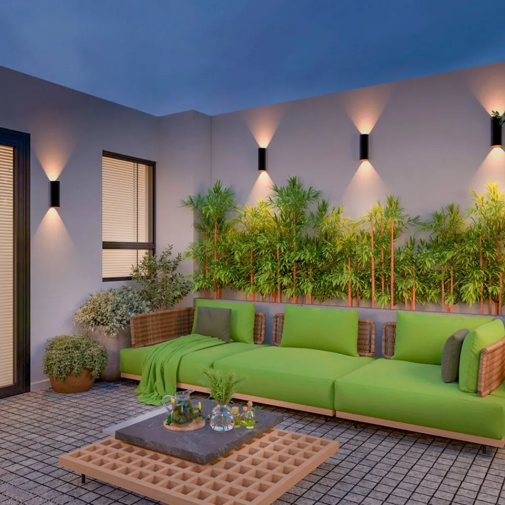 Sylindrisk LED utendørs vegglampe Round med glassdeksel, topp- og bunnfordeling Vegglampen Round brukes til moderne aksent- og orienteringsbelysning på fasader og inngangspartier. Armaturhuset i aluminium har en enkel, høy sylindrisk form med svart finish. Beskyttet bak glassdeksler er det integrert to varmhvite LED-lyskilder som stråler både oppover og nedover – Kapslingsgrad: IP54 – Inkludert LED-driver med konstant strøm (av/på)