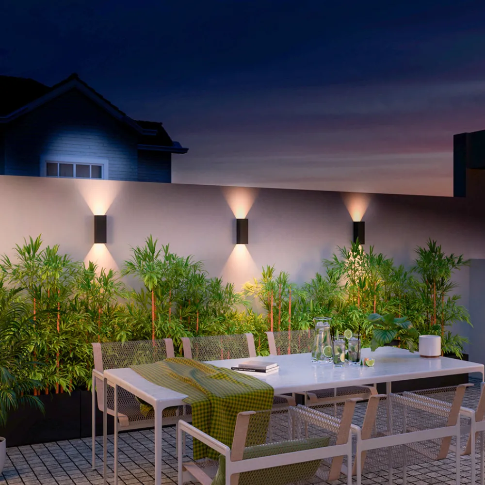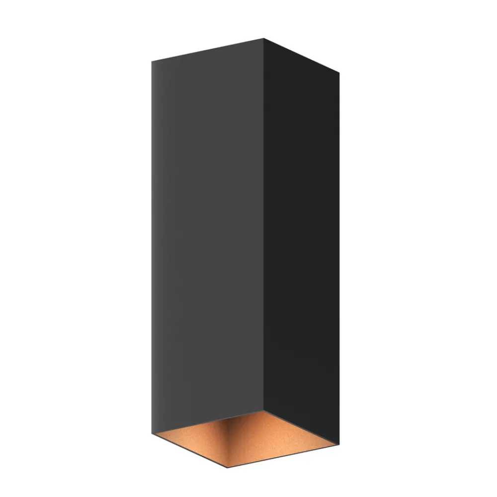 Rektangulær kuboid LED-vegglampe med glassdeksel, topp- og bunnfordeling Rektangulær utendørs vegglampe brukes til moderne aksent- og orienteringsbelysning på fasader og inngangspartier. Armaturhuset i aluminium har en enkel, høy, kubisk form med svart finish. To varmhvite LED-lyskilder er beskyttet bak glassdeksler og avgir lys både oppover og nedover – Kapslingsgrad: IP54 – Inkluderer LED-driver med konstant strøm (av/på)