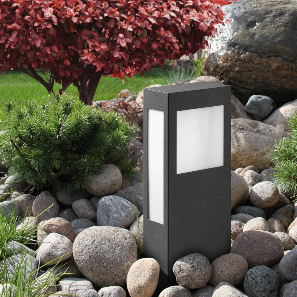 Sokkellampen Aqua Paulo med makrolonskiver er robust og slagfast. Det antrasittfargede huset i vertikal kvadratisk form sørger med fire opalglas for en behagelig rundbelysning i terrenget. En spesiell fordel med sokkellampen er den fleksible installeringen. Den kan skrus fast på betongfundamenter eller på steingulv. Ved hjelp av en jordspyd kan den også festes i bakken. Jordspydet er tilgjengelig som tilbehør. Lampen er produsert av en tysk produsent og leveres med varmhvit 7 W 2G11 LED-pære.