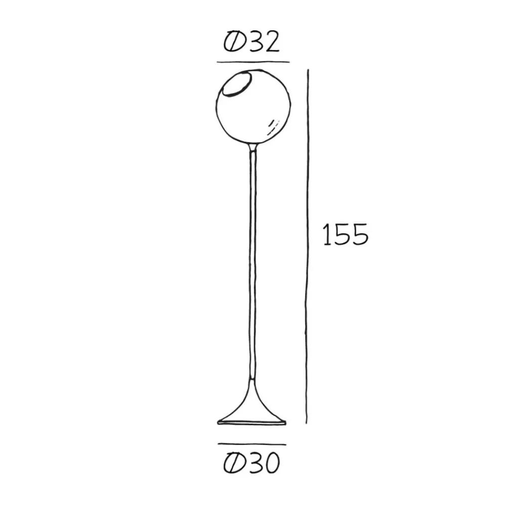 Integrert dimmer: Ballroom-gulvlampe med håndblåst glasskjerm Den kunstferdig utformede Ballroom-gulvlampen fra DESIGN BY US er et velkomment blikkfang overalt. Sokkelen er laget av monokromt lakkert jern. På denne troner den kuleformede skjermen av munnblåst, håndmalt glass. En E27-pære (ikke inkludert, se tilbehør) passer i lampeskjermen. En matt hvit pære anbefales også for den hvite versjonen, mens en pære med synlig glødetråd bør velges for alle andre fargevarianter, ettersom pæren kan ses gjennom glasskjermen. Du bør alltid velge en lyskilde som kan dimmes, da det er mulig å regulere lysintensiteten ved hjelp av bryteren som er integrert i støpselet. Ballroom-gulvlampen er alltid et elegant designobjekt, også når lyset ikke er slått på. Merk: Hver håndblåst glasslampe er unik. Det kan forekomme opp til 0,5 cm store bobler i glasset.